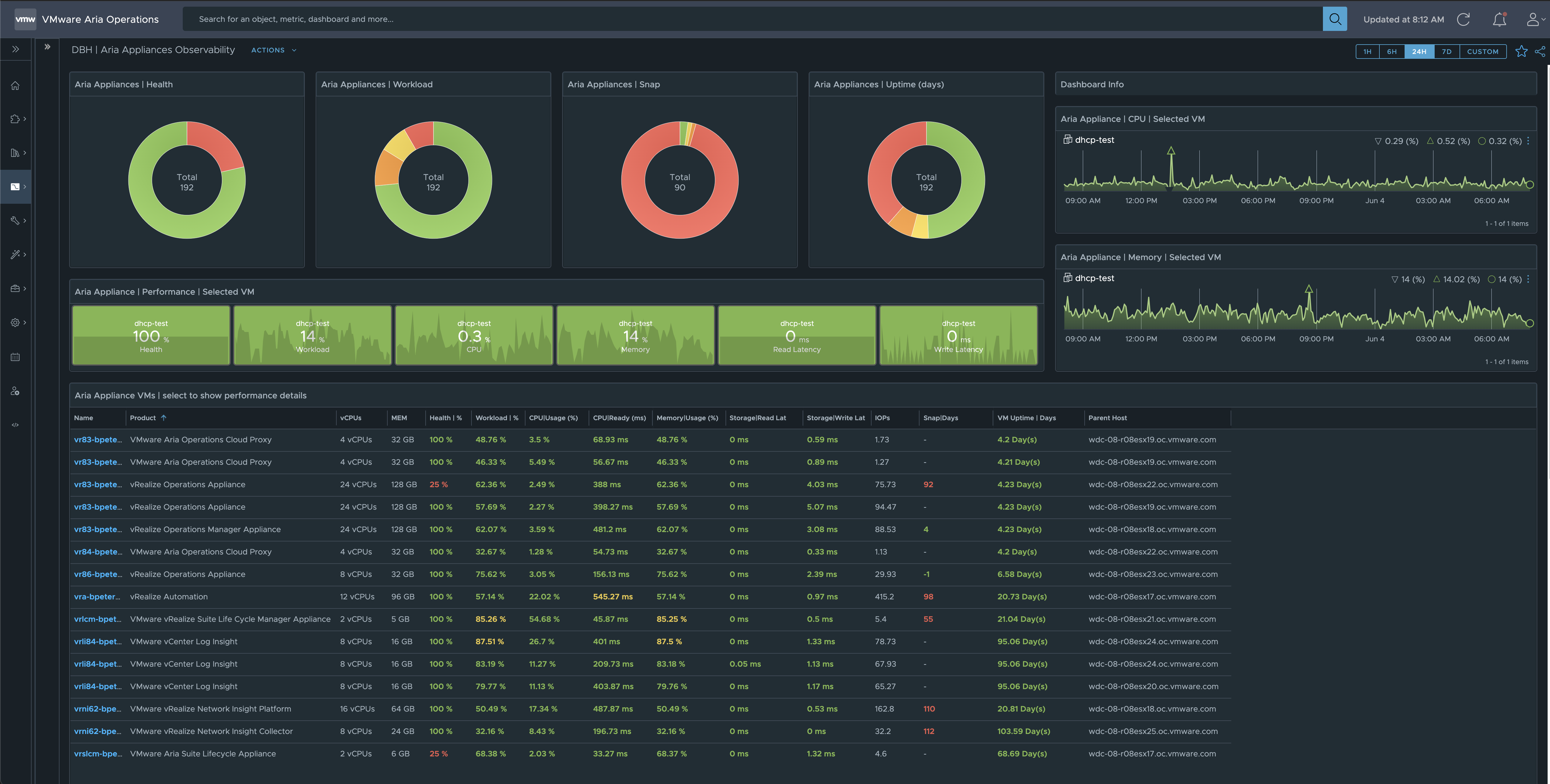 I have a strong preference against VMs running on snapshots for extended periods, which is why I included a chart for Snapshots. Uptime is also a crucial metric, as it provides insight into a VMs maintenance status. When I see a VM running for hundreds of days, my first thought is that it hasn’t been patched or upgraded in a while. To ensure the best reliability and access to the latest features, it’s important to keep Aria Appliances patched and upgraded regularly.