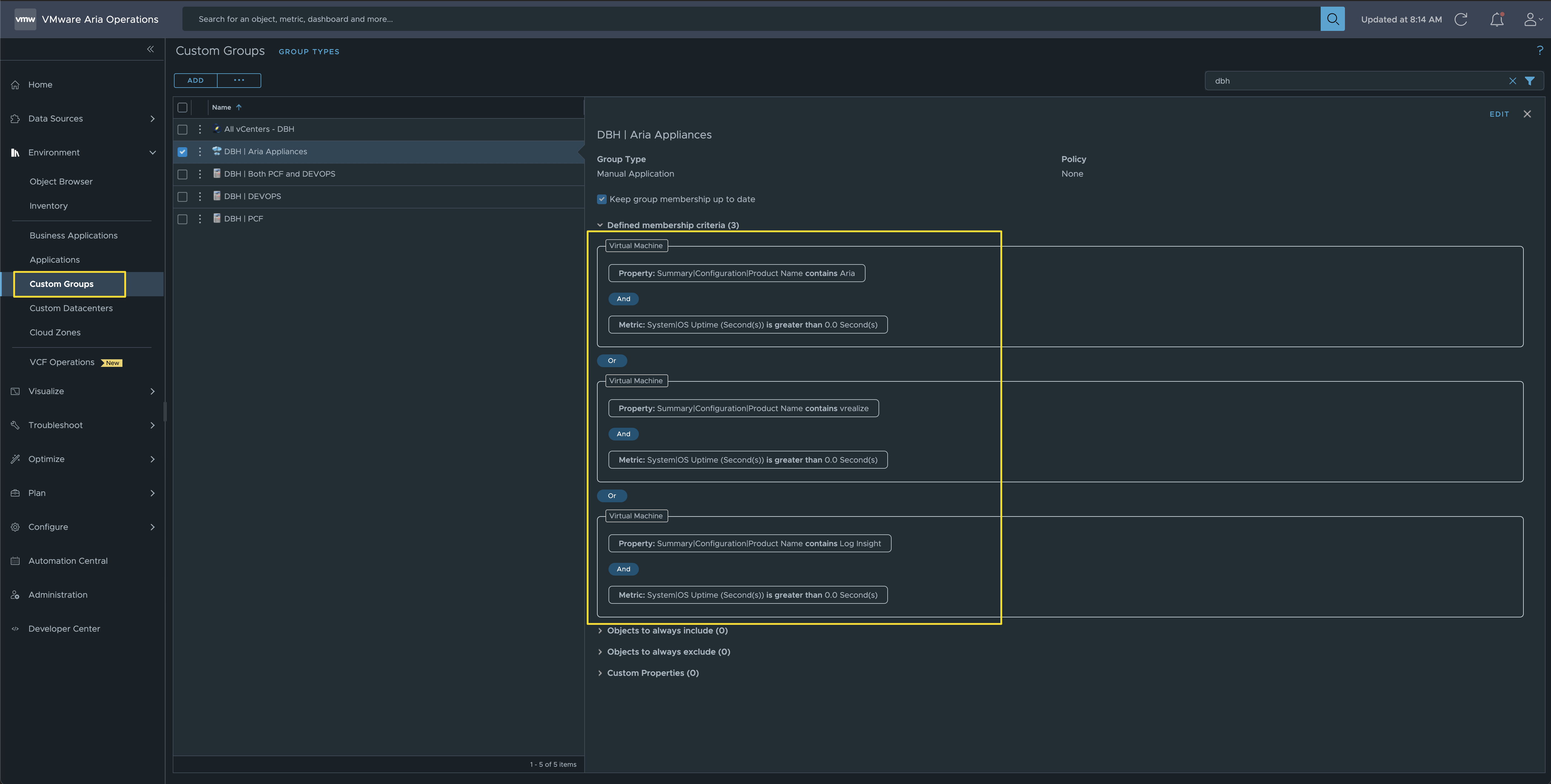 For VMware Aria Appliances, I created a Custom Group within VMware Aria Operations. These appliances have a property named “Summary|Configuration|Product Name”. By using a filter that checks if the Product Name contains “Aria”, “vRealize”, or “Log Insight”, I was able to group all VMware Aria Appliance VMs together. See Screen Shot below.