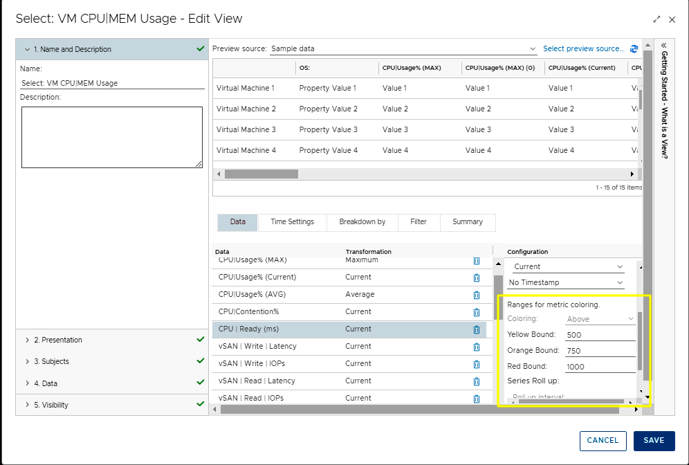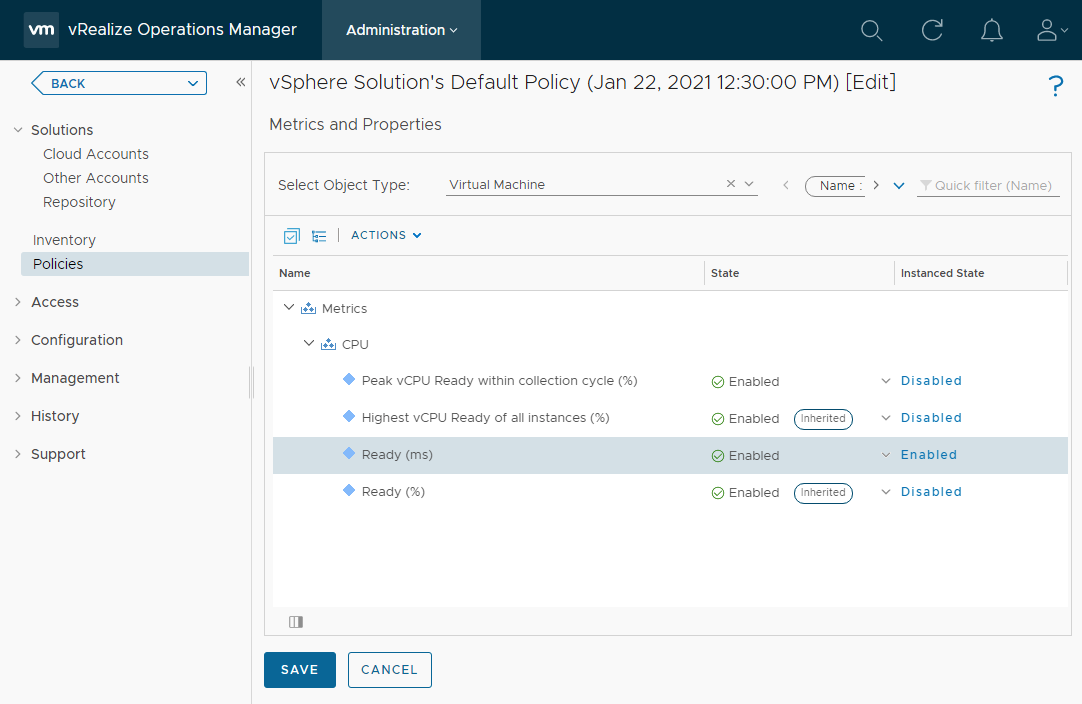 When I looked at vROPS OOTB (Out of the Box) the VM CPU Metric CPU|Ready (ms) was not being collected. I wanted to be able to show the CPU Metric CPU|Ready (ms) in a Right-Size/Performance Dashboard to show APP Owners this value.