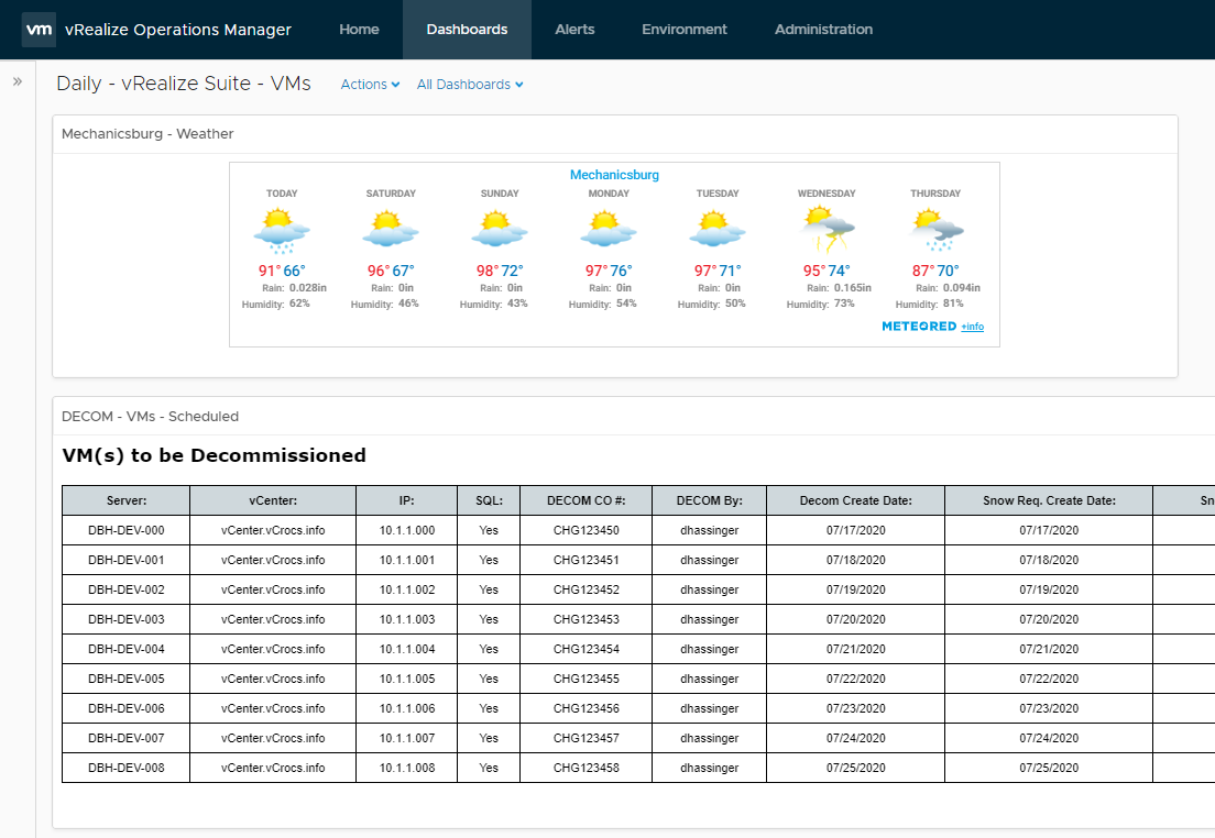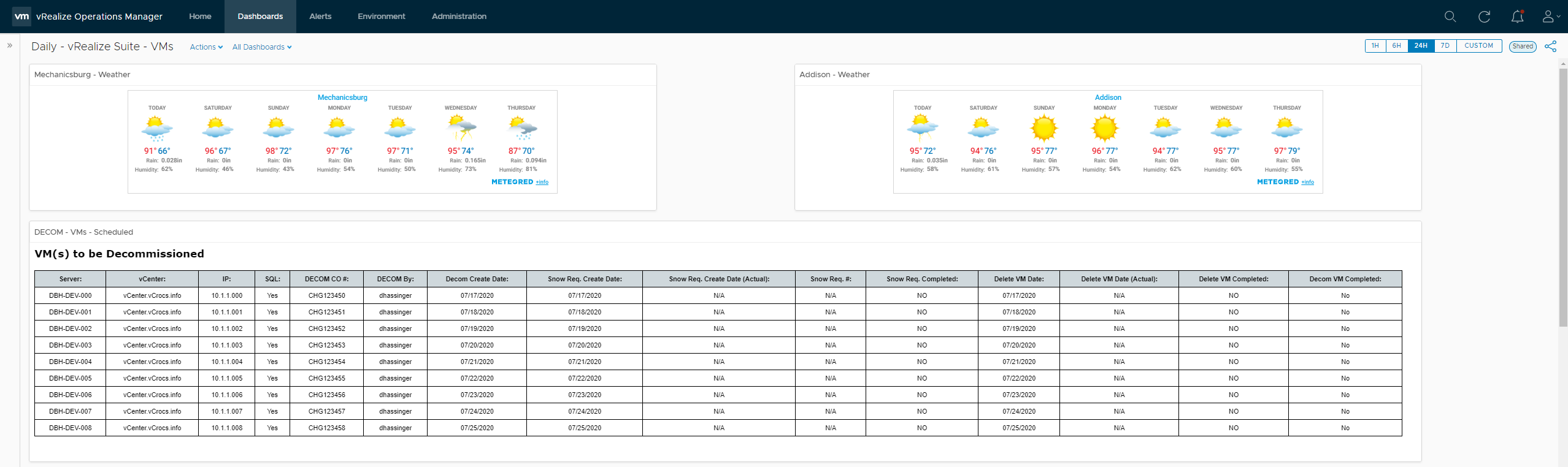 The reason I wanted to show Weather and SQL data is to use vRealize Operations Dashboards as the “Single Pane of Glass” for all monitoring. I have never seen a demo from VMware to use the “Text Display” Widget this way but I think this is awesome. This could completely change the way I use vRealize Operations Dashboards. There are not always vRealize Operations Management Packs available and this provides a cool way to show any data on a Dashboard. The data will be for reference only but it does allow the “Single Pane of Glass”.