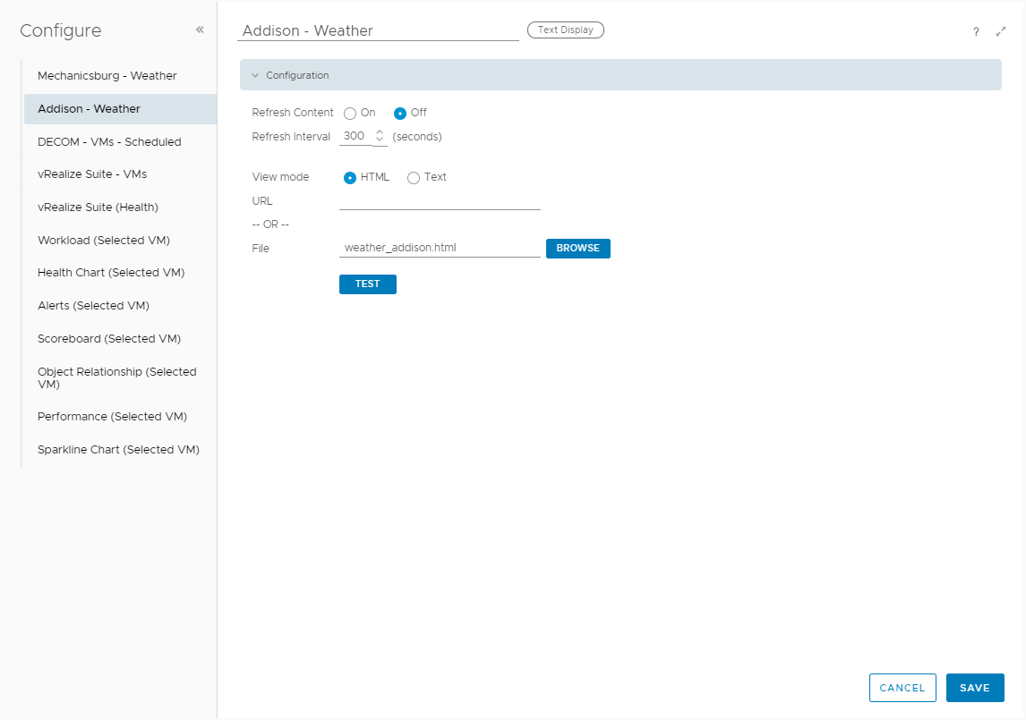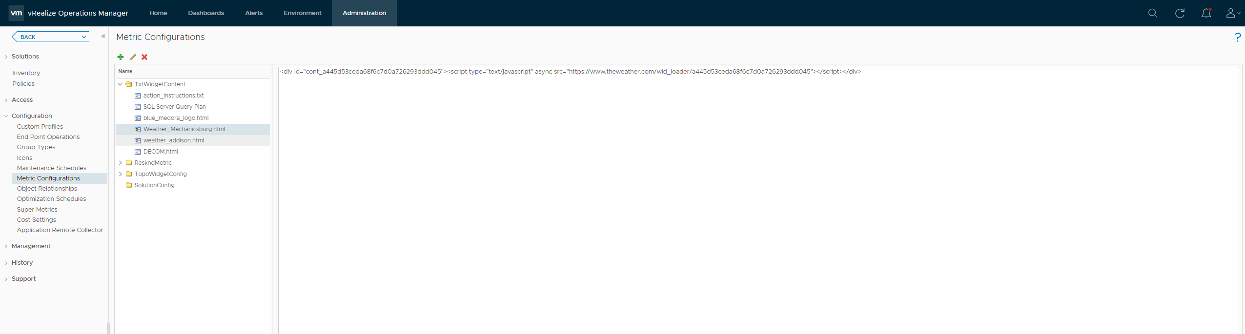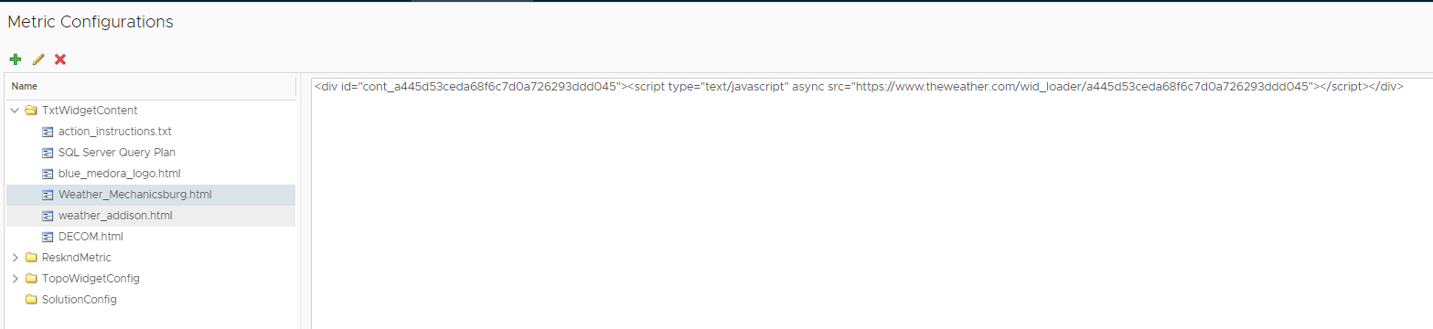 The first thought I had was to display the weather for both the data center locations where I work. This could be used with a NOC type Dashboard. I looked online for a weather widget site and got the code to display the weather for the specific locations. If you go to Administration/Configuration/Metric Configurations/TxtWidgetContent you can create html files to save the widget code. See examples in images below. You can display any Widget data from any web site that provides widgets using the “Text Display” Widget.