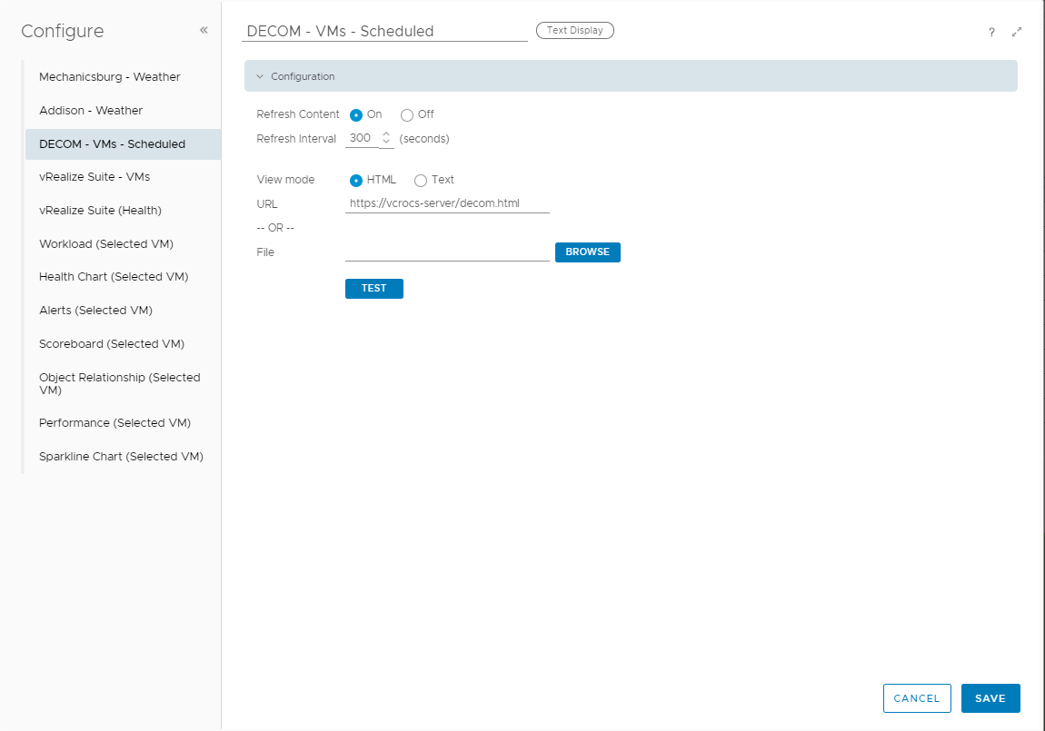 I was recently reviewing some sample custom vRealize Operations Dashboards and I seen where some of the Dashboards had custom text and images. I reviewed how they included the text and images and in some of the sample Dashboards they used the “Text Display” Widget and used a url for the content. They would display images saved on a web server. I thought this was interesting and started reviewing what else could be displayed by using a url with the “Text Display” Widget.