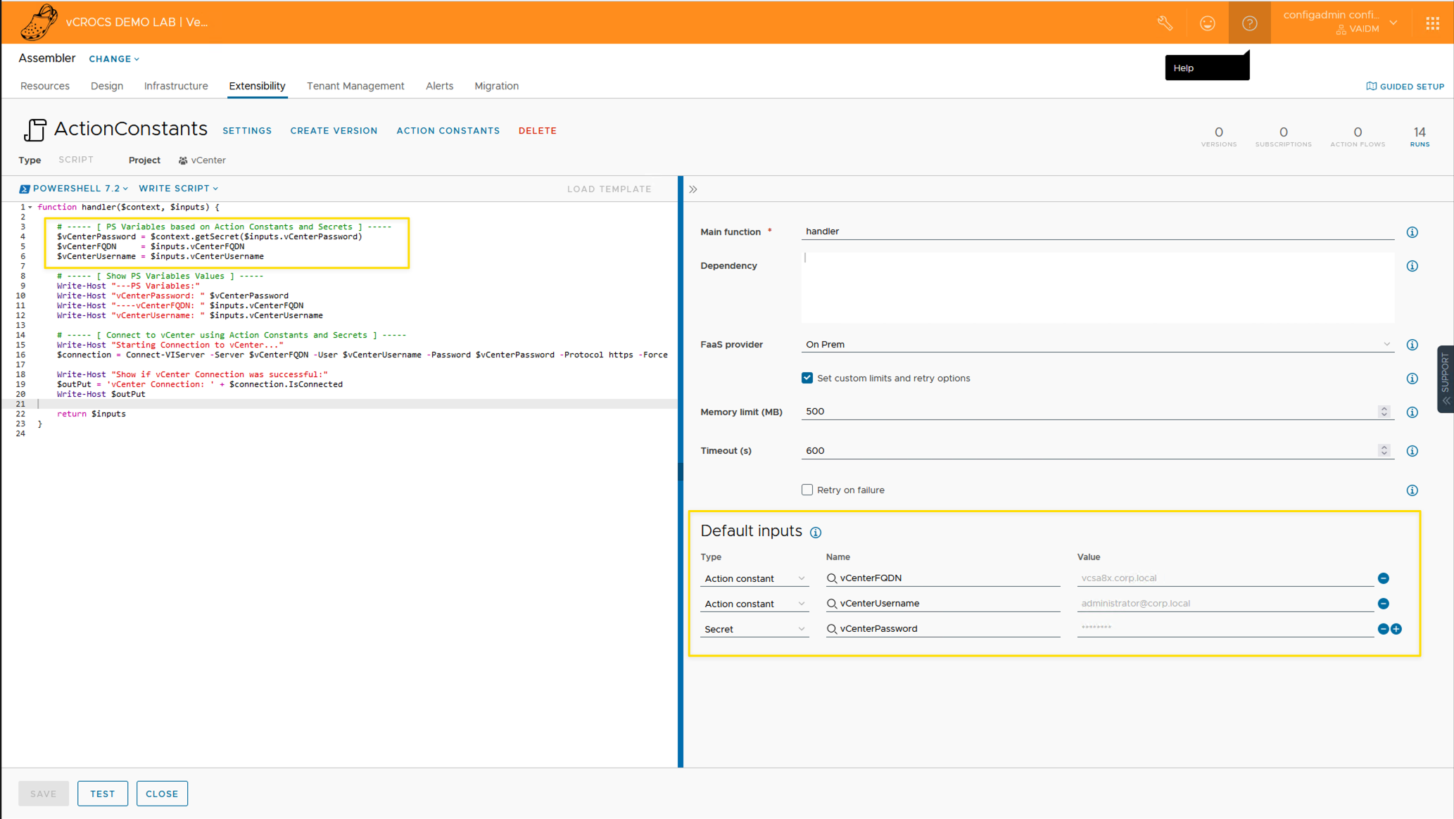 - In the example code, review how I am connecting to the vCenter. No hard coded Username, Password or vCenter FQDN. If any of these values would change, I would never need to edit the Action, only the Action Constants and Secret.