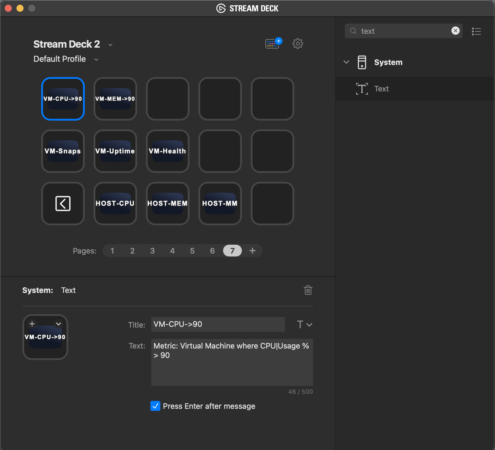 If you’re thinking to yourself, I don’t want to have to type or copy/paste these metric searches everyday, I have a solution. STREAM DECK! If you ever wanted an excuse to spend the money for a Stream Deck, now is the time! You can program the buttons of a Stream Deck to do the searches. There is a button type in the Stream Deck called text. Enter the metric search query as the text. See the screen shot below. AWESOME!