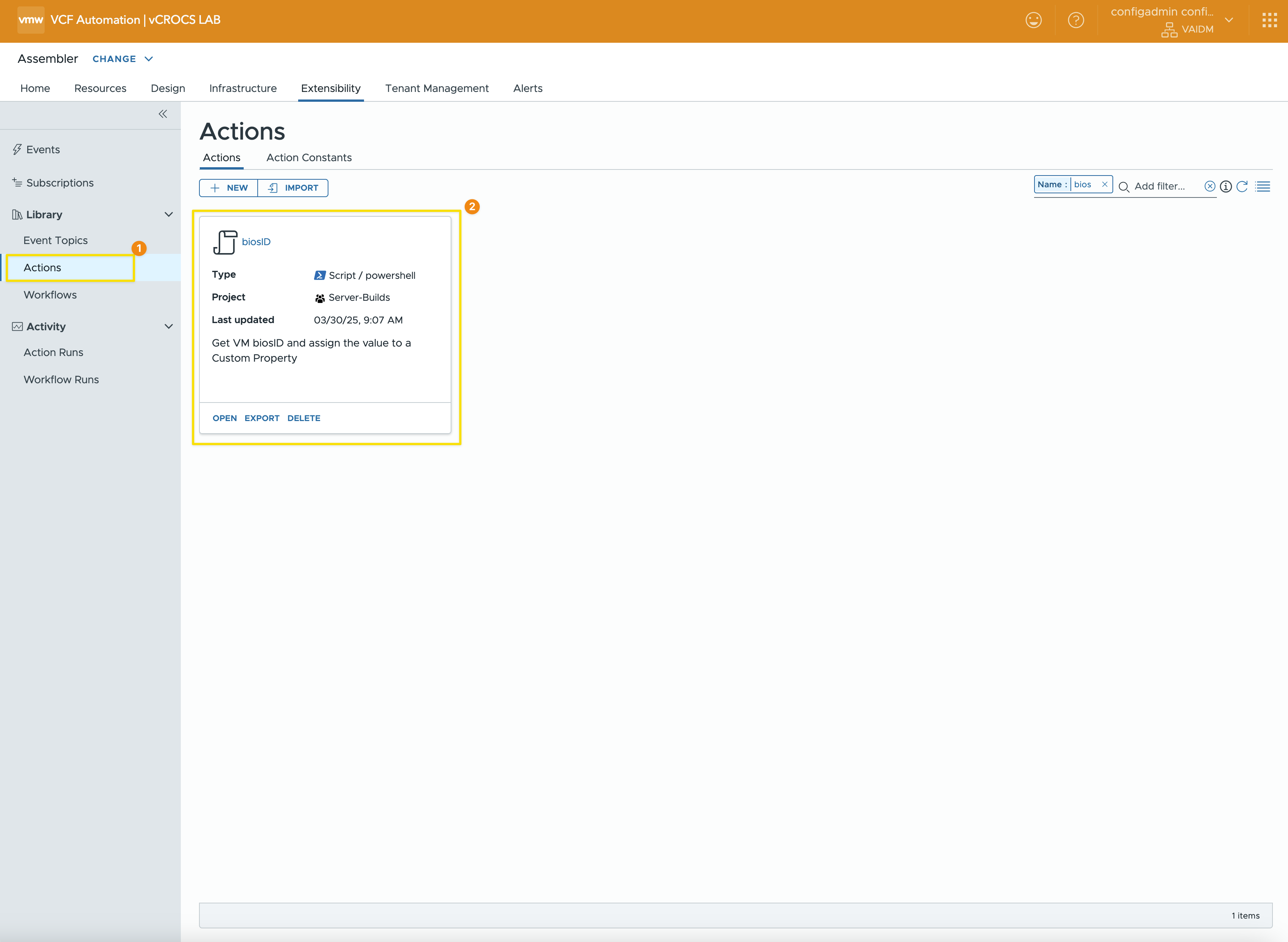 - The ABX Action connects to vCenter, retrieves the VM’s “bios id”, and writes it back as a customProperty on the deployment.