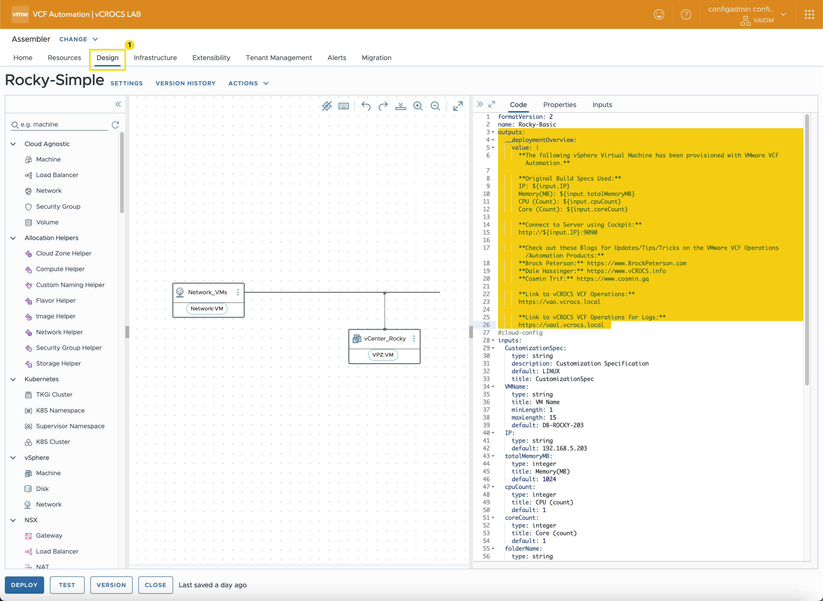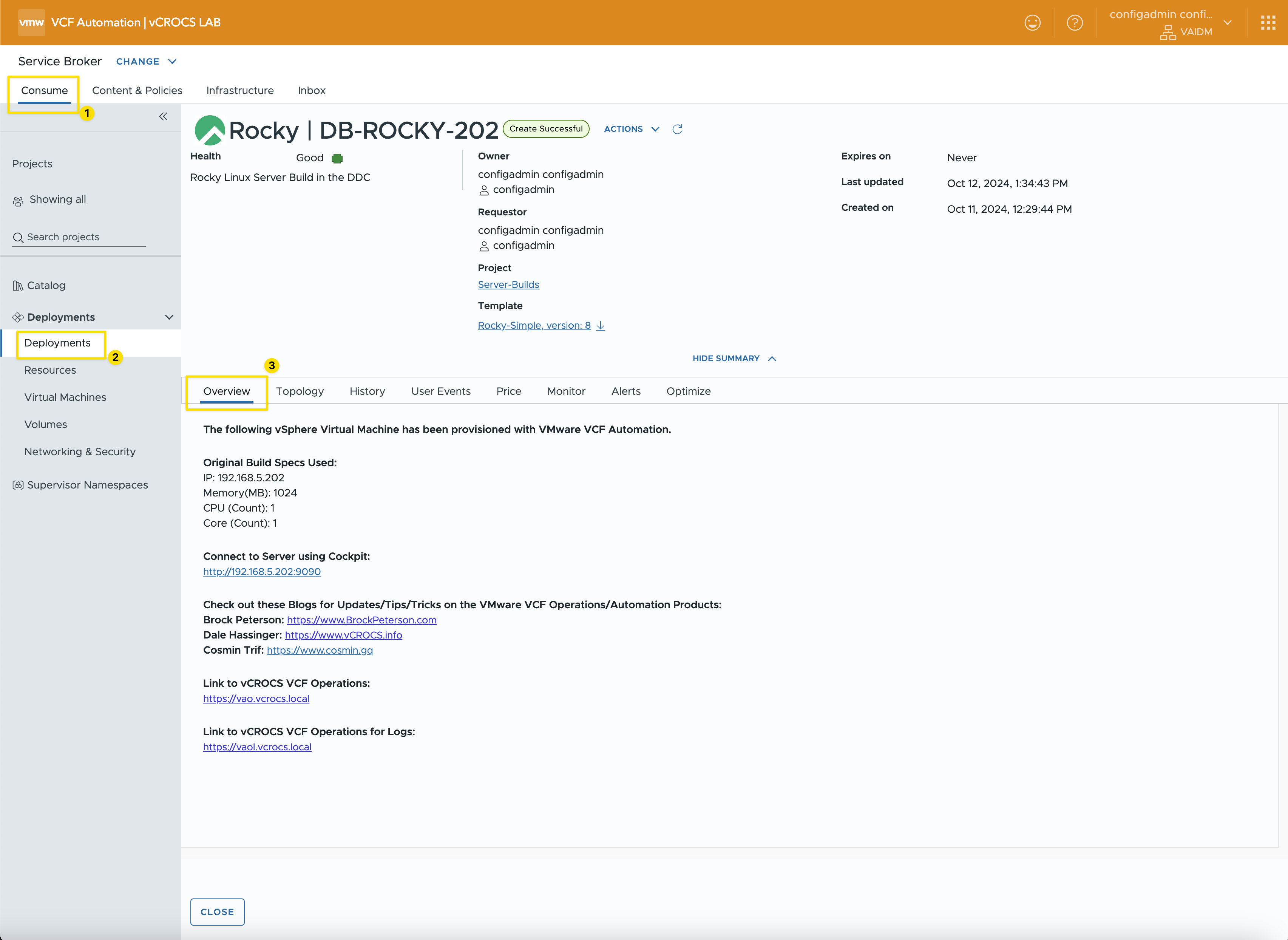 When VCF Automation introduced the Overview Tab in Deployments, I quickly began using it in my lab to streamline communication. Previously, I sent emails with crucial details about new server VM builds to the user initiating the deployment. Now, I’ve shifted to adding this information directly into the Deployment Overview Tab.