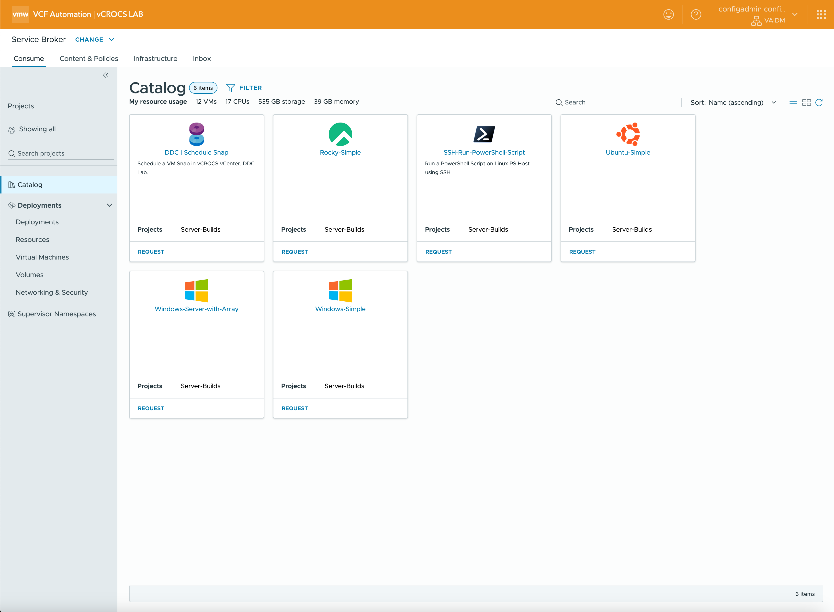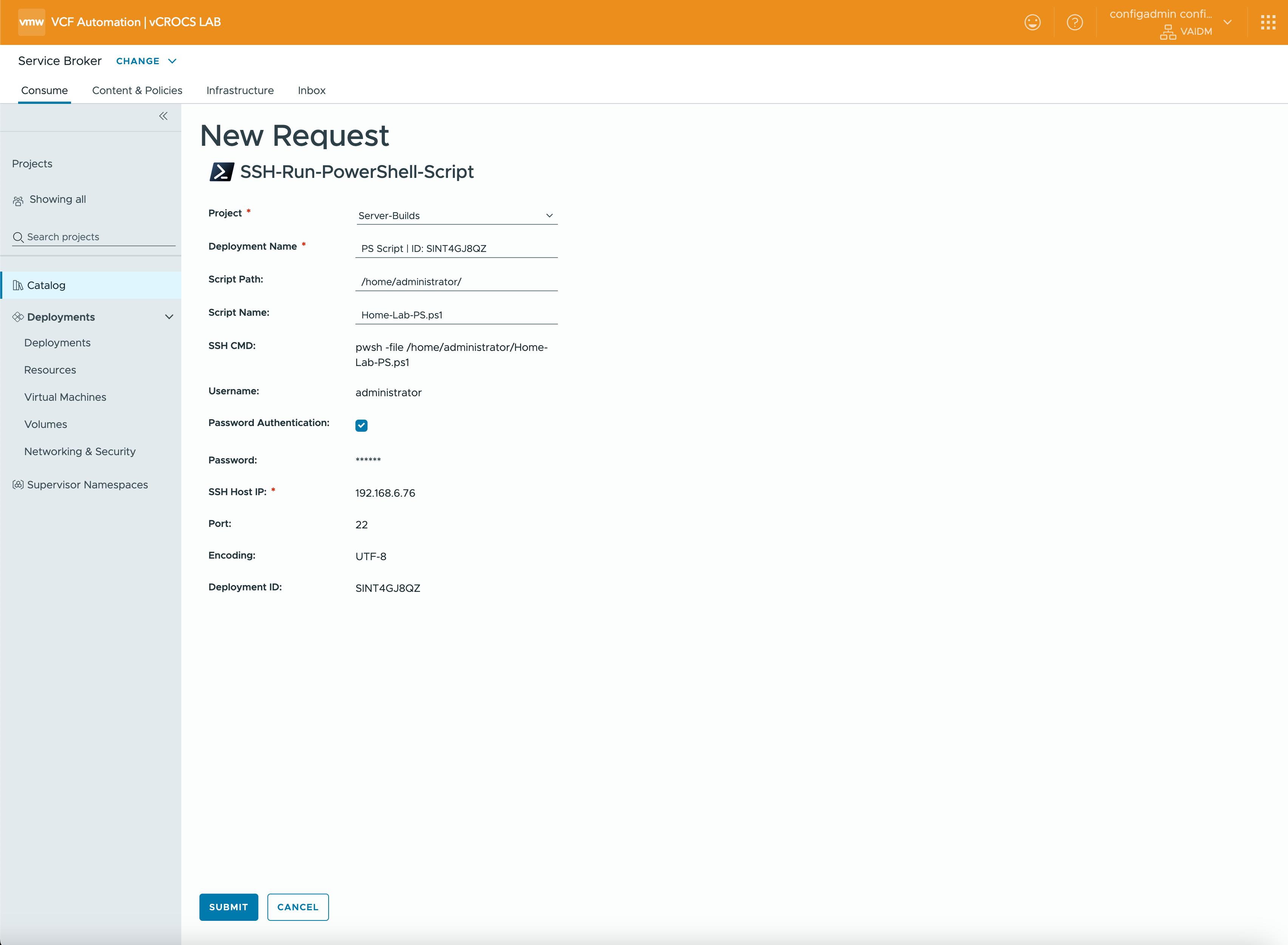 - VCF Automation Catalog with an Option to run the Orchestrator Workflow that was created to run the script on Rocky Linux