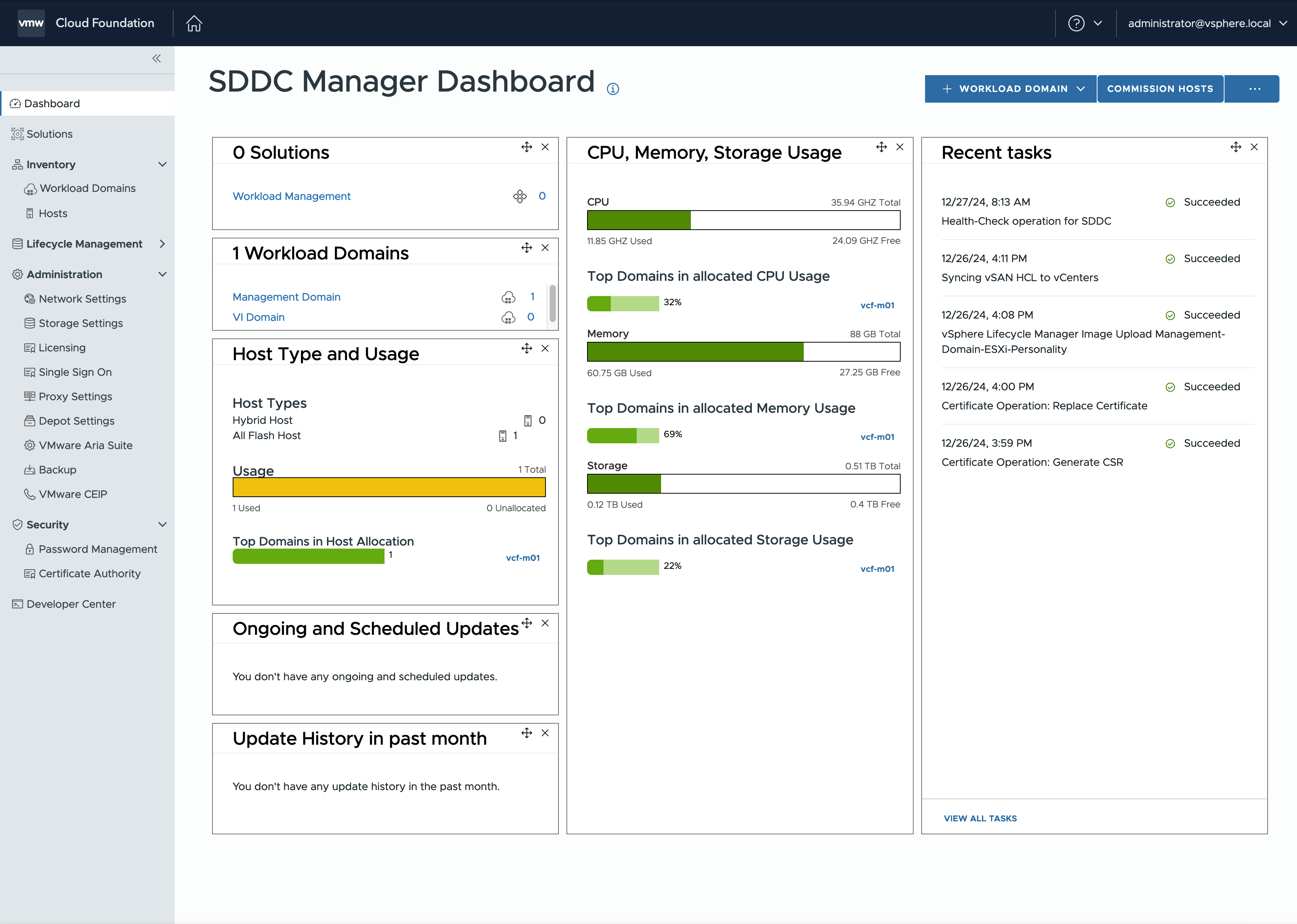 Screen Shot of the VCF SDDC Manager - You can see that the performance is good for a Home Lab environment: