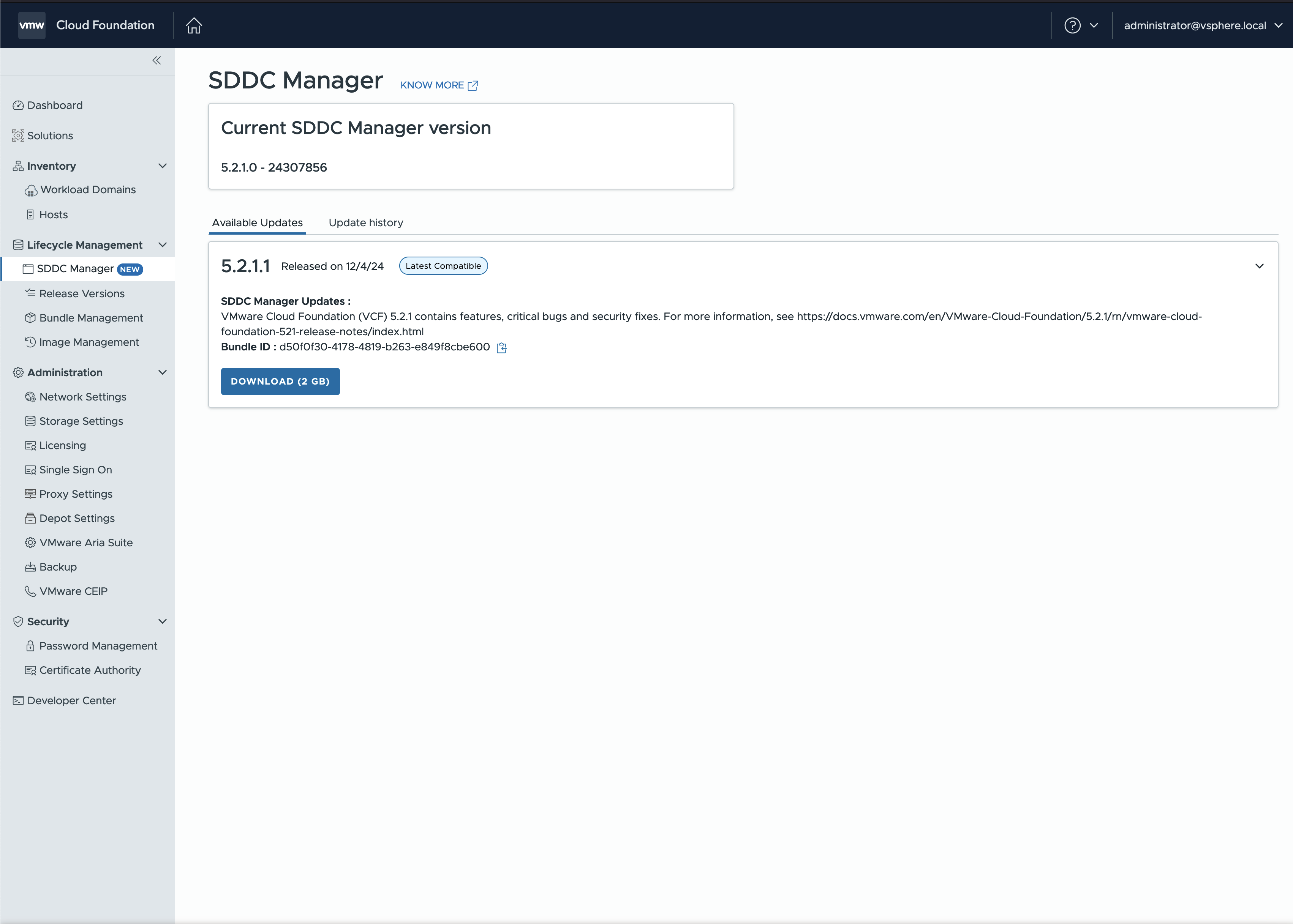 Screen Shot of the VCF SDDC Manager - By installing version 5.2.1, I also have the opportunity to upgrade to 5.2.1.1 and learn the upgrade process: