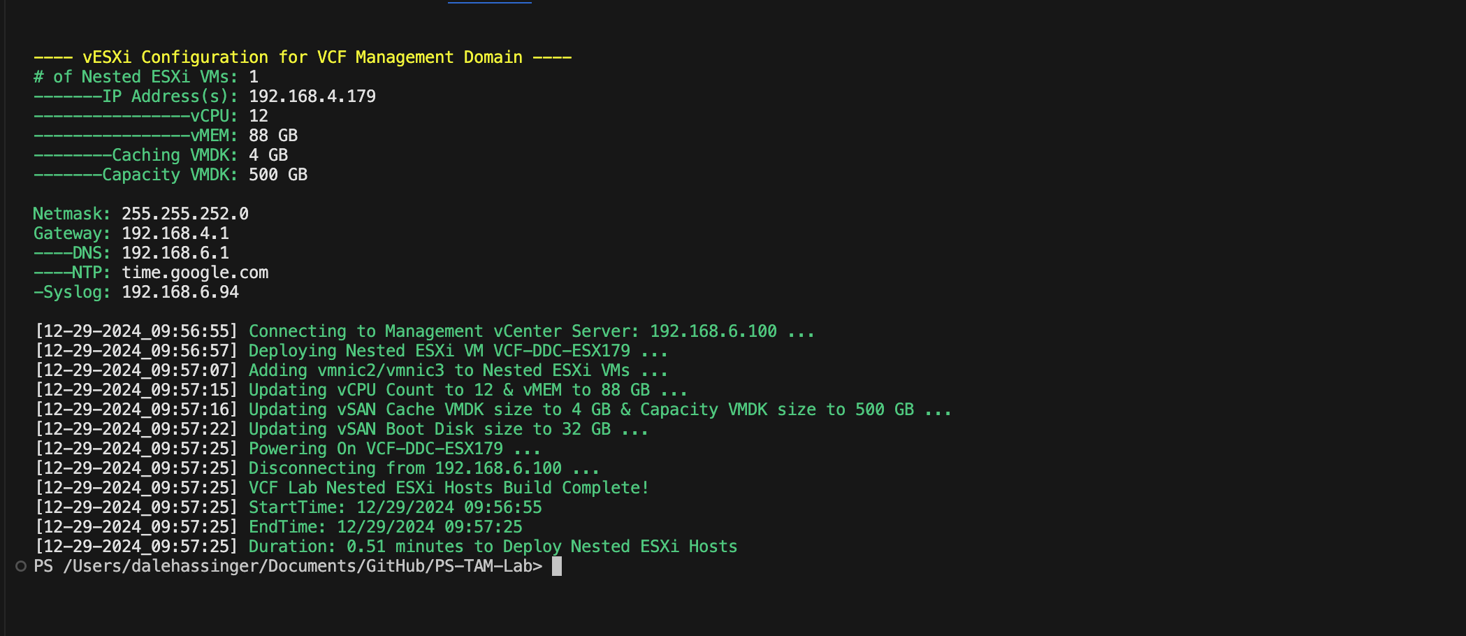 Screen Shot of the Nested ESXi install PowerShell Script output: