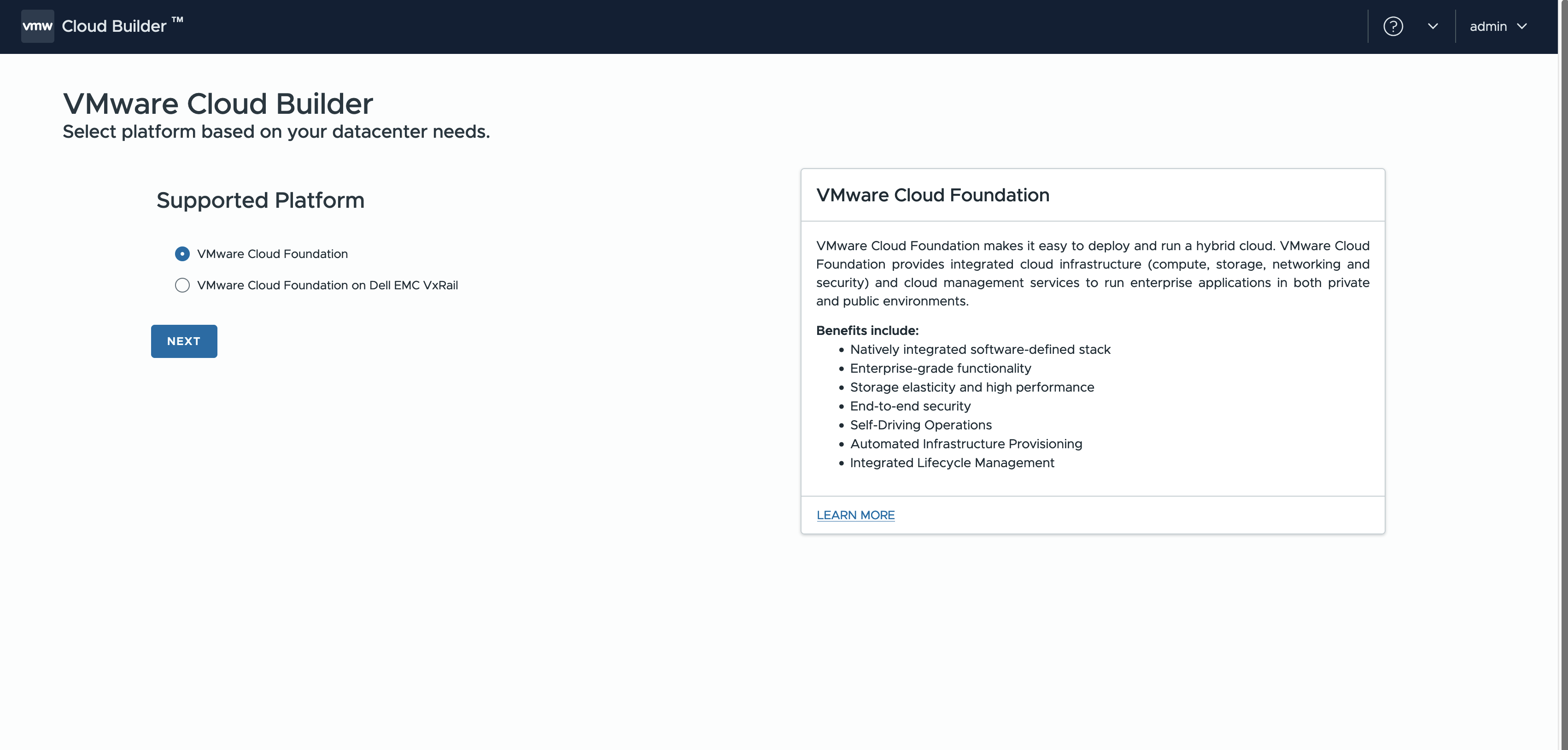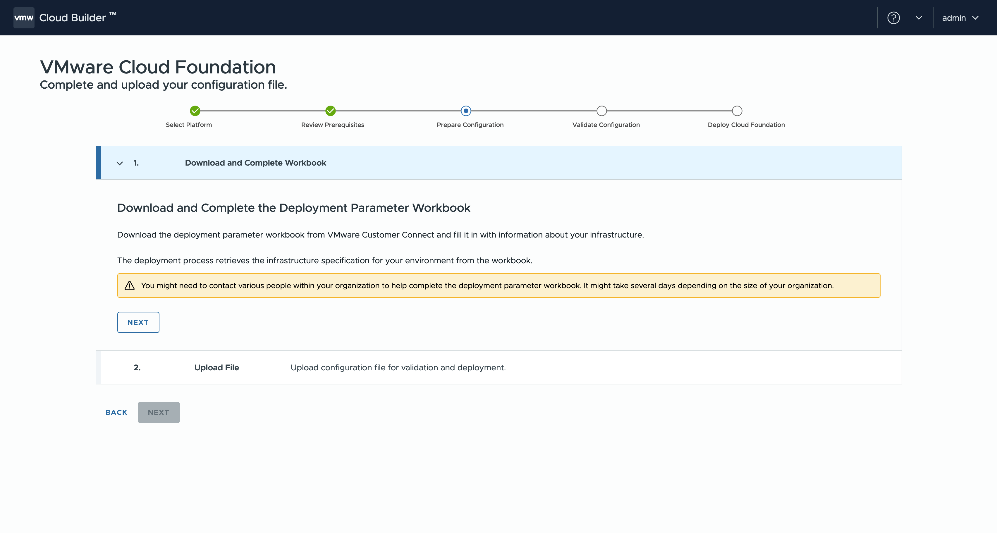 Screen Shot of VCF Cloud Builder Deploy wizard, step 1: