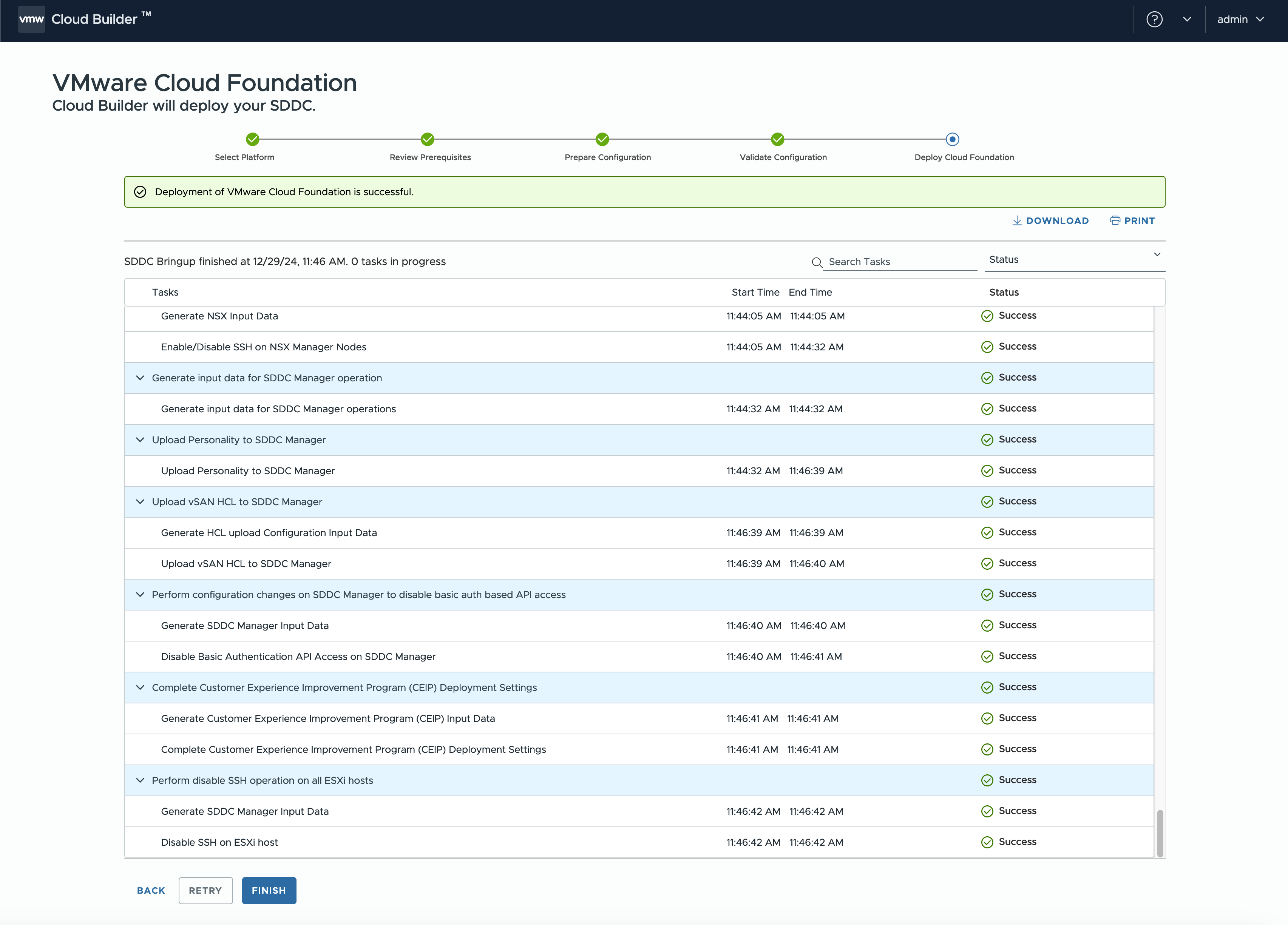 Screen Shot of the VCF Cloud Builder - A successful VCF deployment!