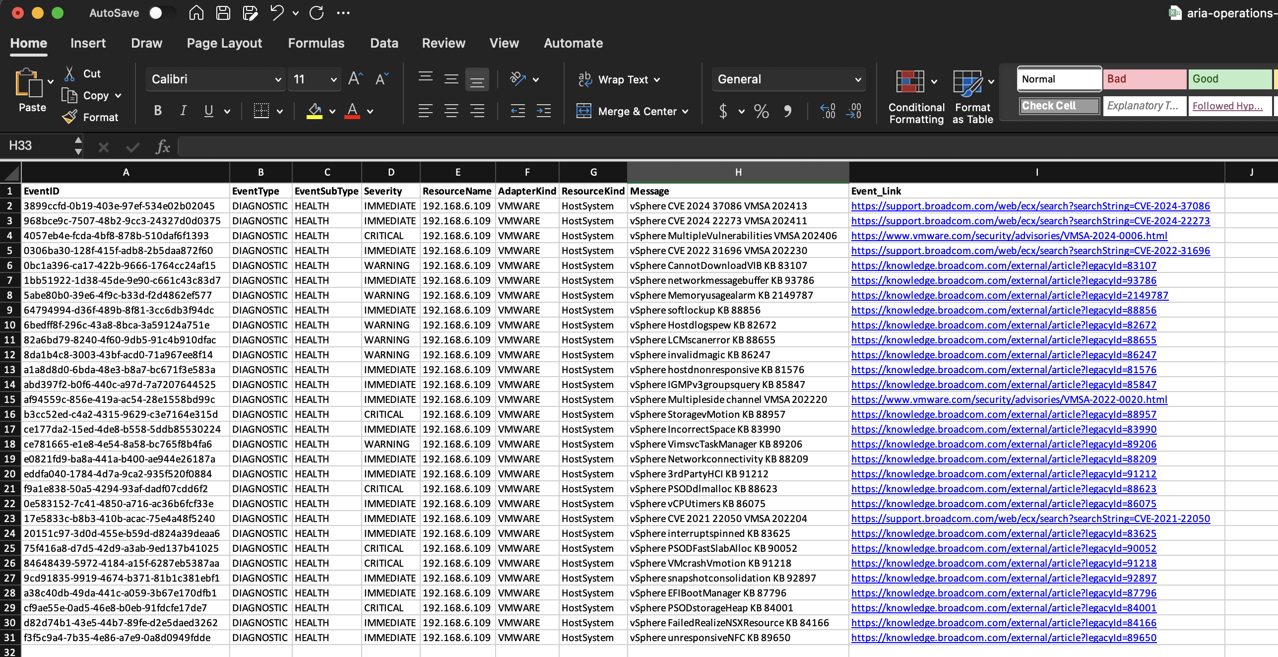 Screen Shot of the VCF Operations Diagnostics Events Excel Spreadsheet: