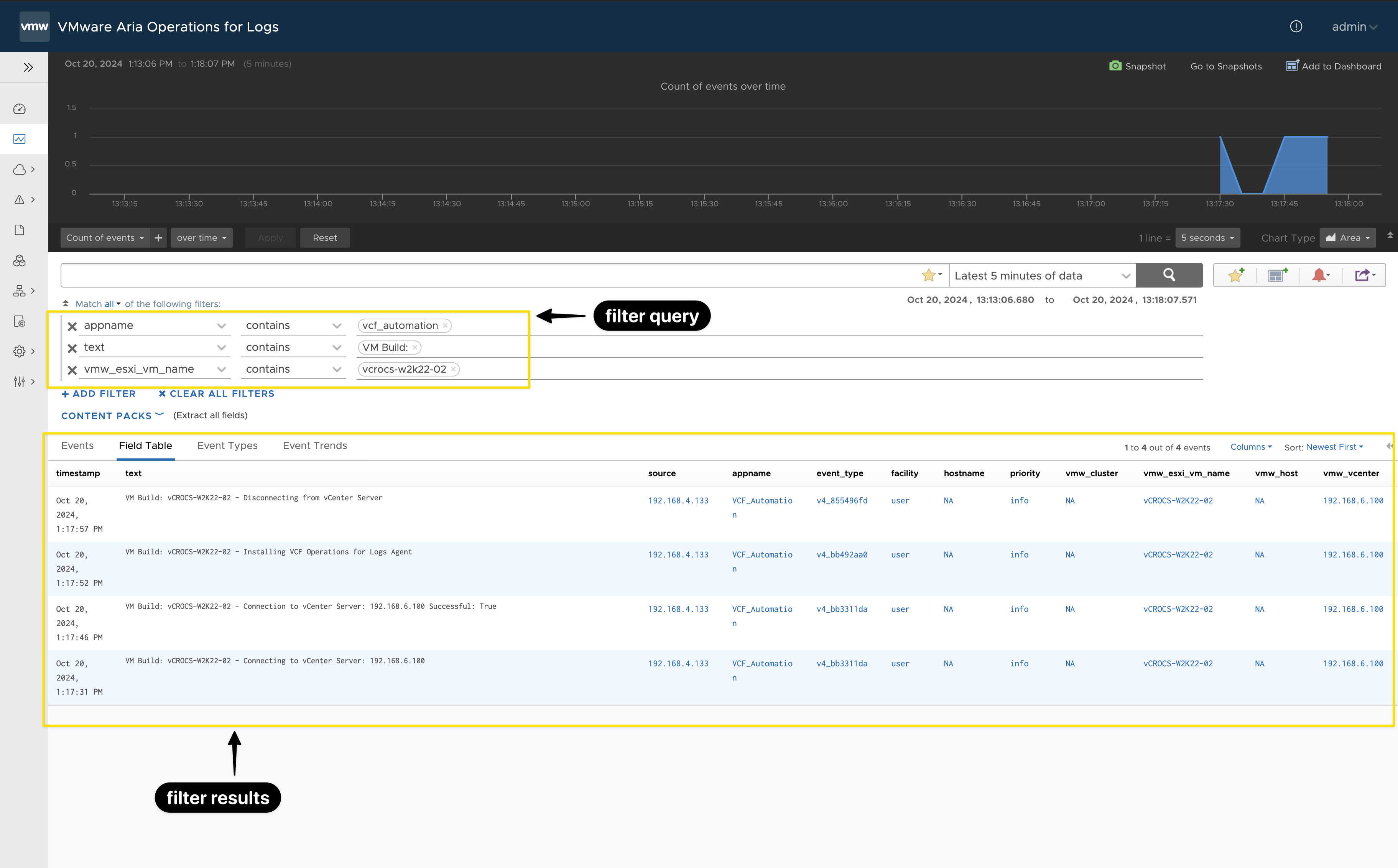 Screen Shot of the VCF Operations for Logs - Filter query and results: