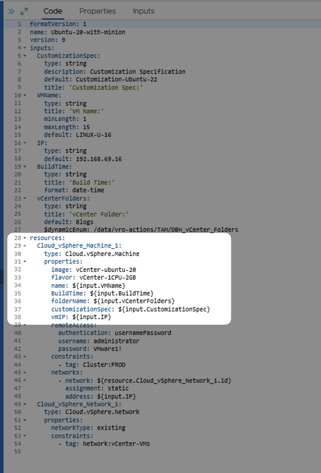 This YAML code shows all the Properties that I want to send to a ABX Action or Orchestrator Workflow.