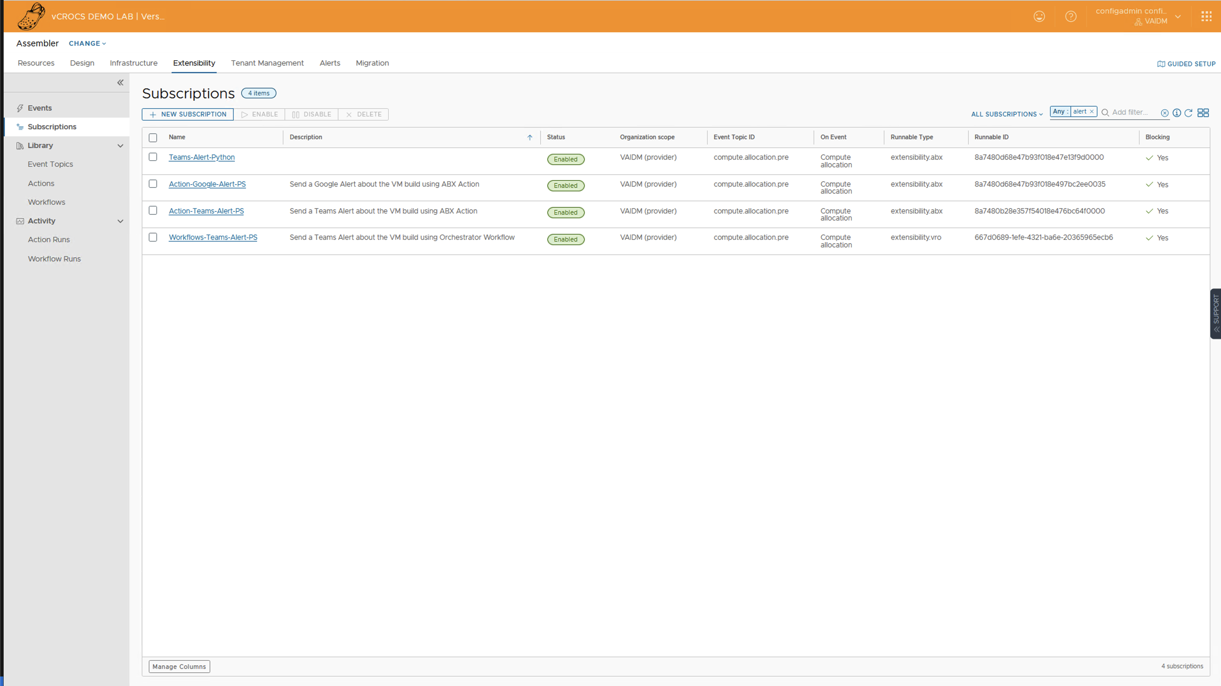 In this blog, I’ll walk you through the creation of a new virtual machine (VM). At the onset of the build process, I have configured an Extensibility Subscription that triggers the sending of notifications to both Microsoft Teams and Google Spaces. This is accomplished through the use of an ABX Action and an Orchestrator Workflow.