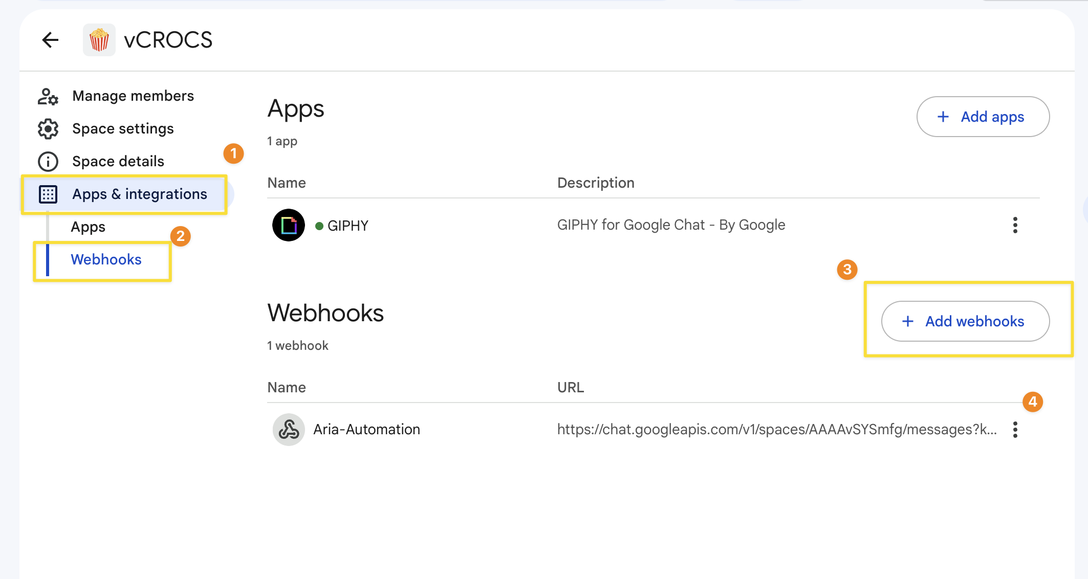 How to create a Google Spaces Webhook. Link included below on how to create a Microsoft Teams Webhook.