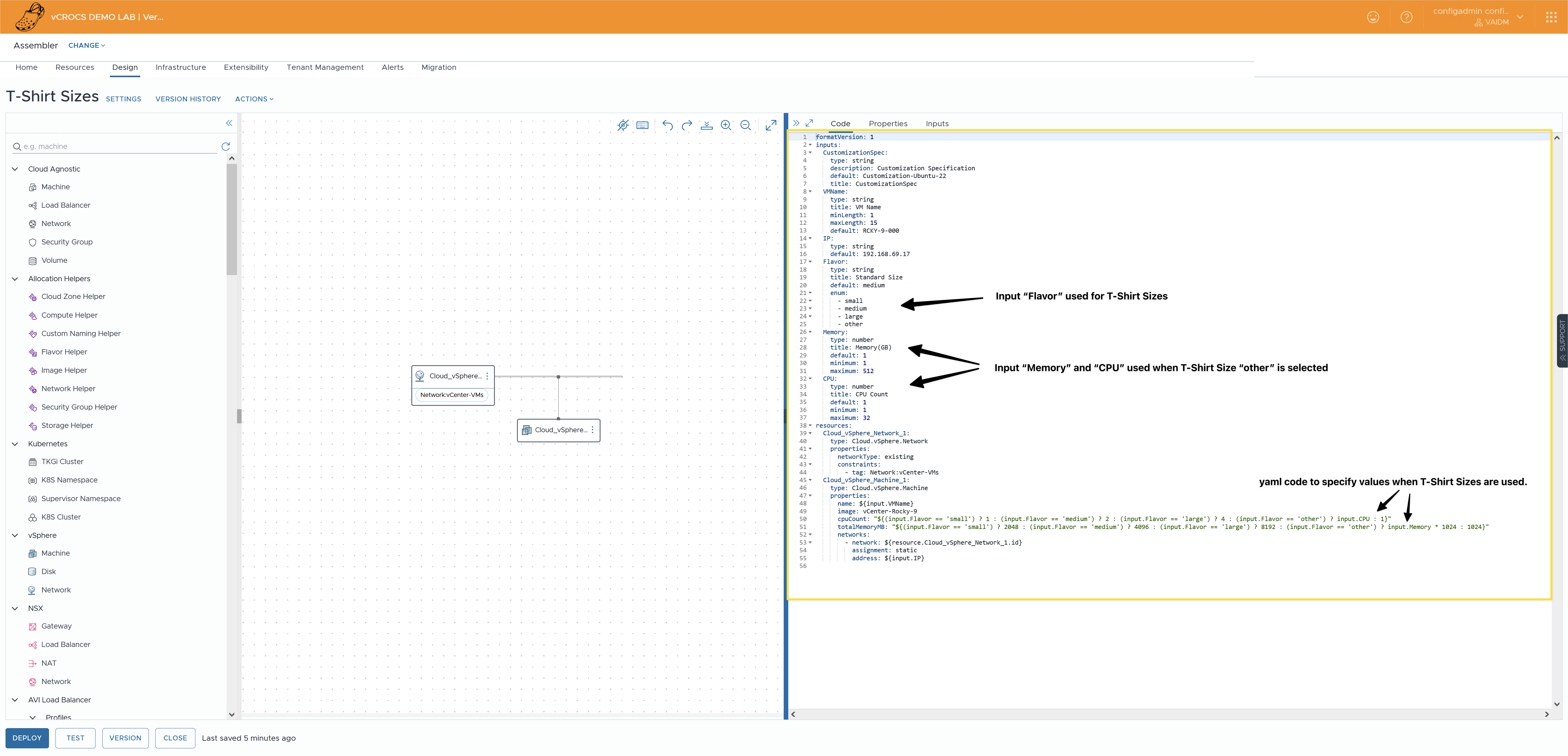 Recently, I was asked how to create new VMs using T-Shirt sizes and also have the flexibility to specify custom CPU and Memory values. Typically, in the YAML code of a Aria Automation Design Template, you use either the properties cpuCount and totalMemoryMB or the flavor property. You cannot use both within the same template for the same VM.
