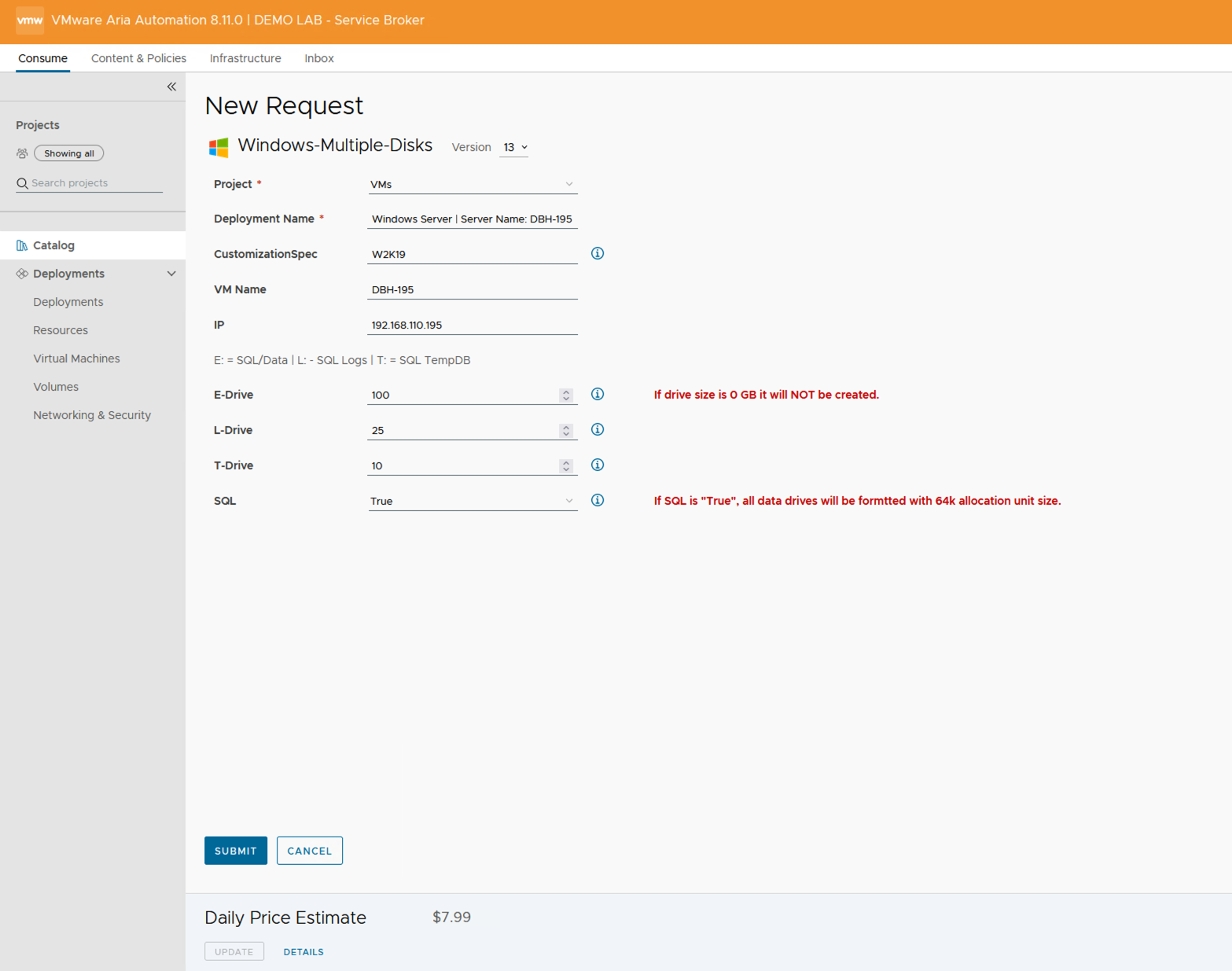 - To make New Windows Server Builds consistent I show the drives that are available on the Catalog Item Custom Form. You don’t need to add any additional drives. Keep the drive sizes at the default size of “0” and the drives DO NOT get created.