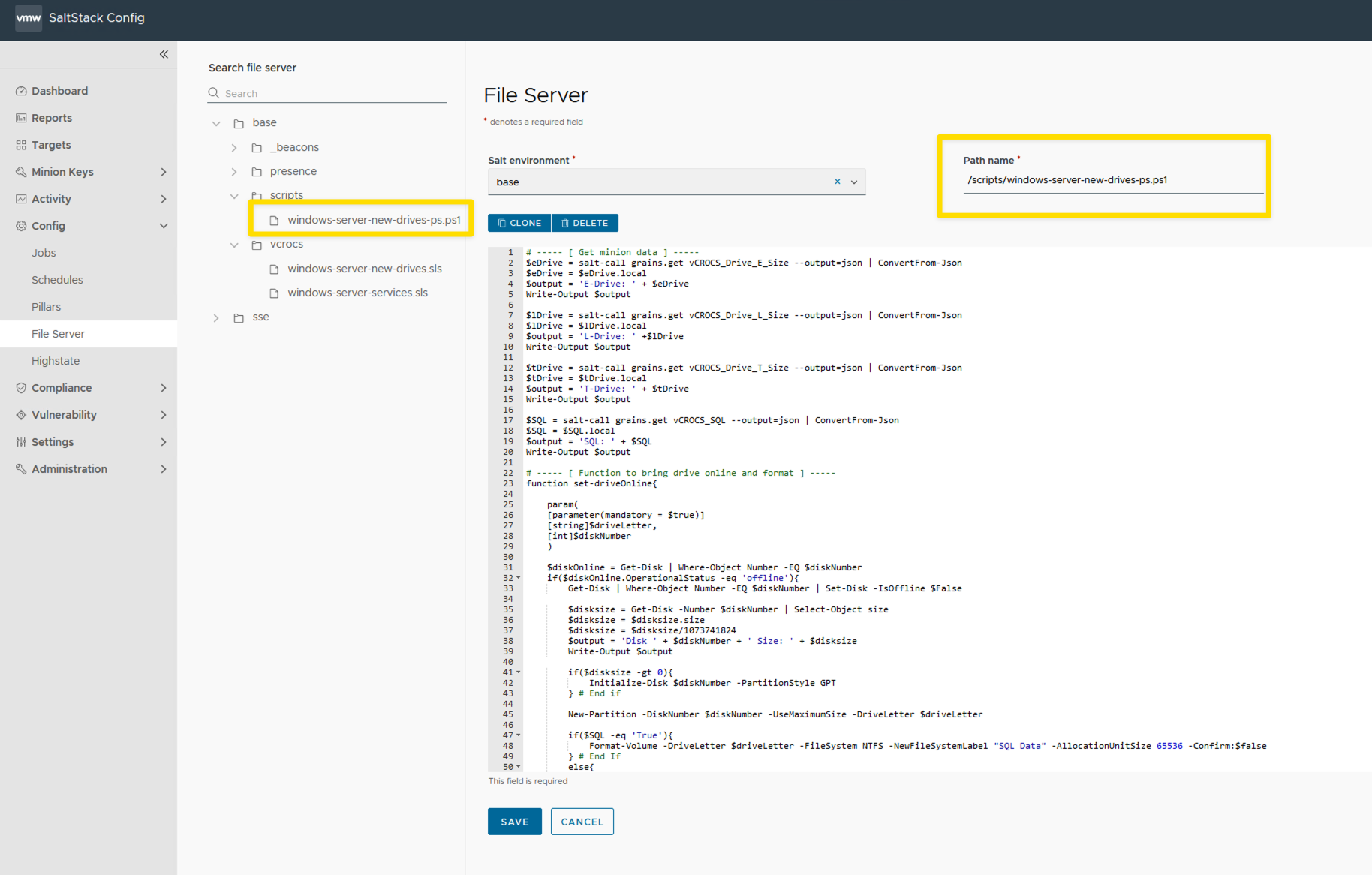 - The PowerShell file is saved within the VMware Aria Automation Config file server.
