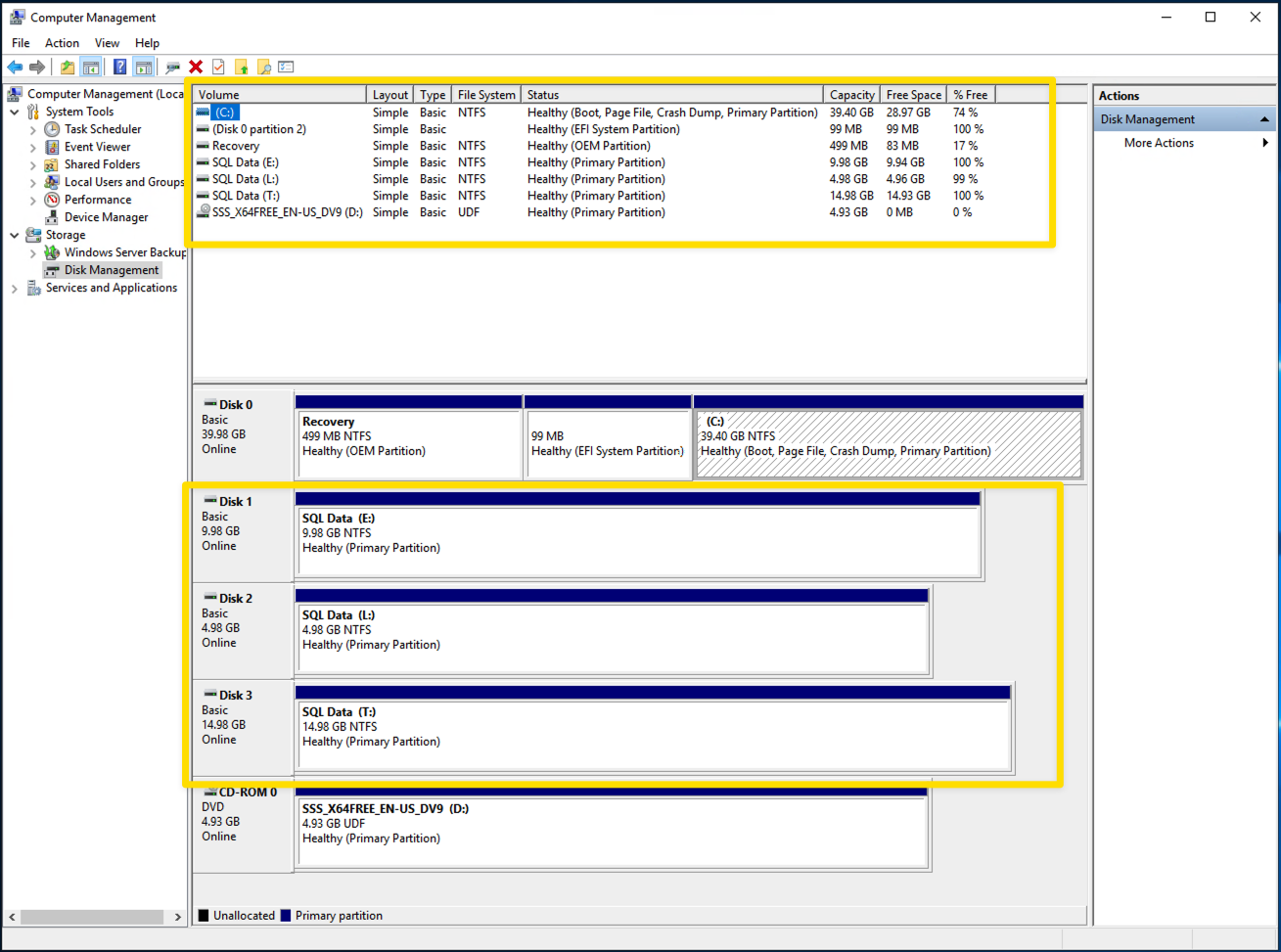 - This screen shot shows how the drives status will be in the Windows Server Disk Management when the New Server Build is Complete. No additional steps are required to start using the drives.