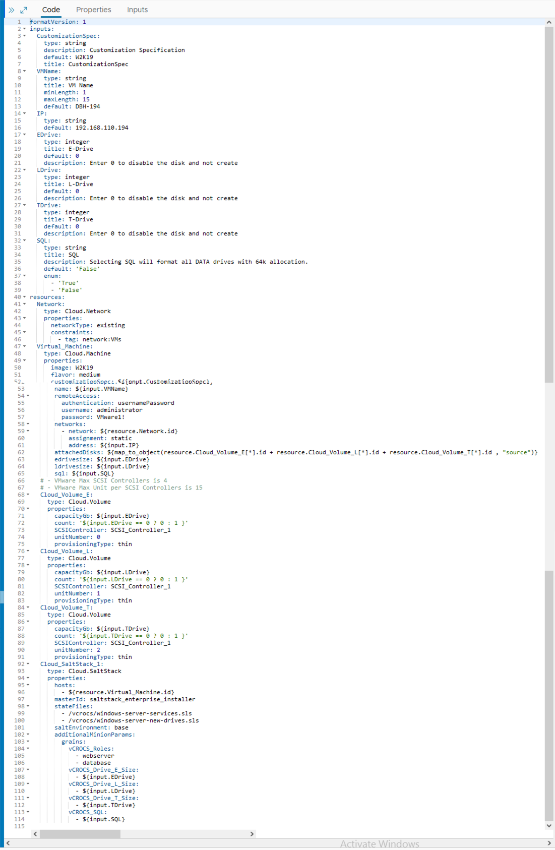 I want to create new Windows Servers in VMware Aria Automation that will be production ready when the server build process is complete. One item when building new Windows Servers is adding drives. I want a way to add additional drives and have the drive be online and formatted properly. Non SQL Windows Servers will have data drives formatted with 4k allocation unit size and Windows SQL Servers will have the data drives formatted with 64k allocation unit size. VMware Aria Automation provides a way to add drives OOTB (Out of the Box) but does not automatically format the drives. That is why I use a Salt state in my example. I use the salt state to bring the new drive online and format. This Blog post shows one way to accomplish these tasks. I always say, with automation there a 100 ways to do the same process. Hopefully this Blog gives you some ideas and options.