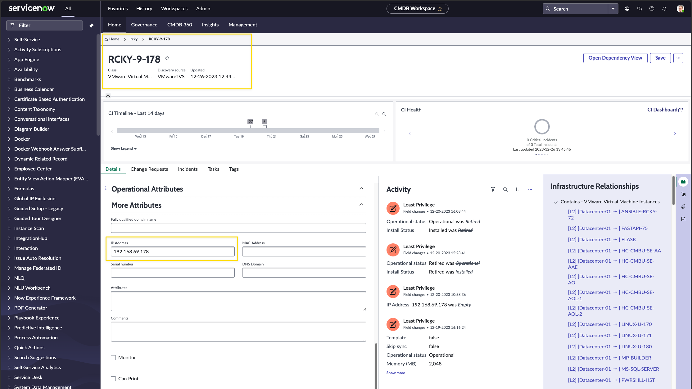 Another Example of how Servicenow CMDB will look with IP Address sent from VMware Aria Operation Management Pack.