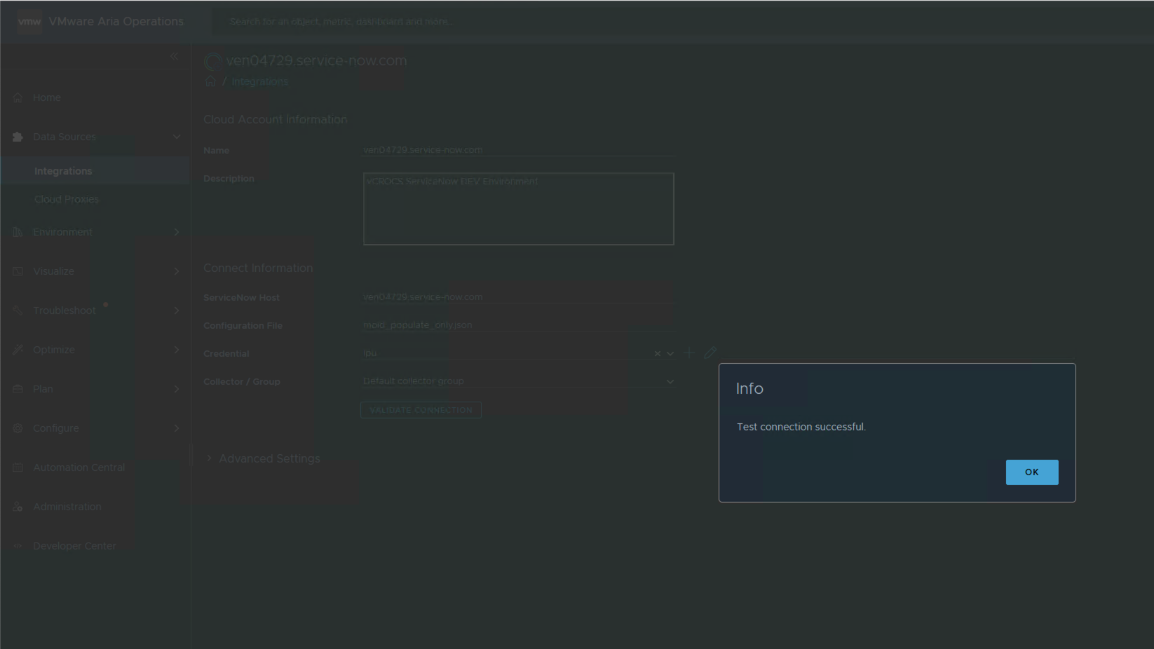 When I added the account to the management pack in Aria Operations, it did a good job to let me know if everything was set up correctly in Servicenow and if the json config file was setup correct. I had a permission wrong and it showed me what was wrong when I did a Validate Connection. I fixed the permission like it showed me and then everything worked. My lab data is now showing up in Servicenow CMDB.