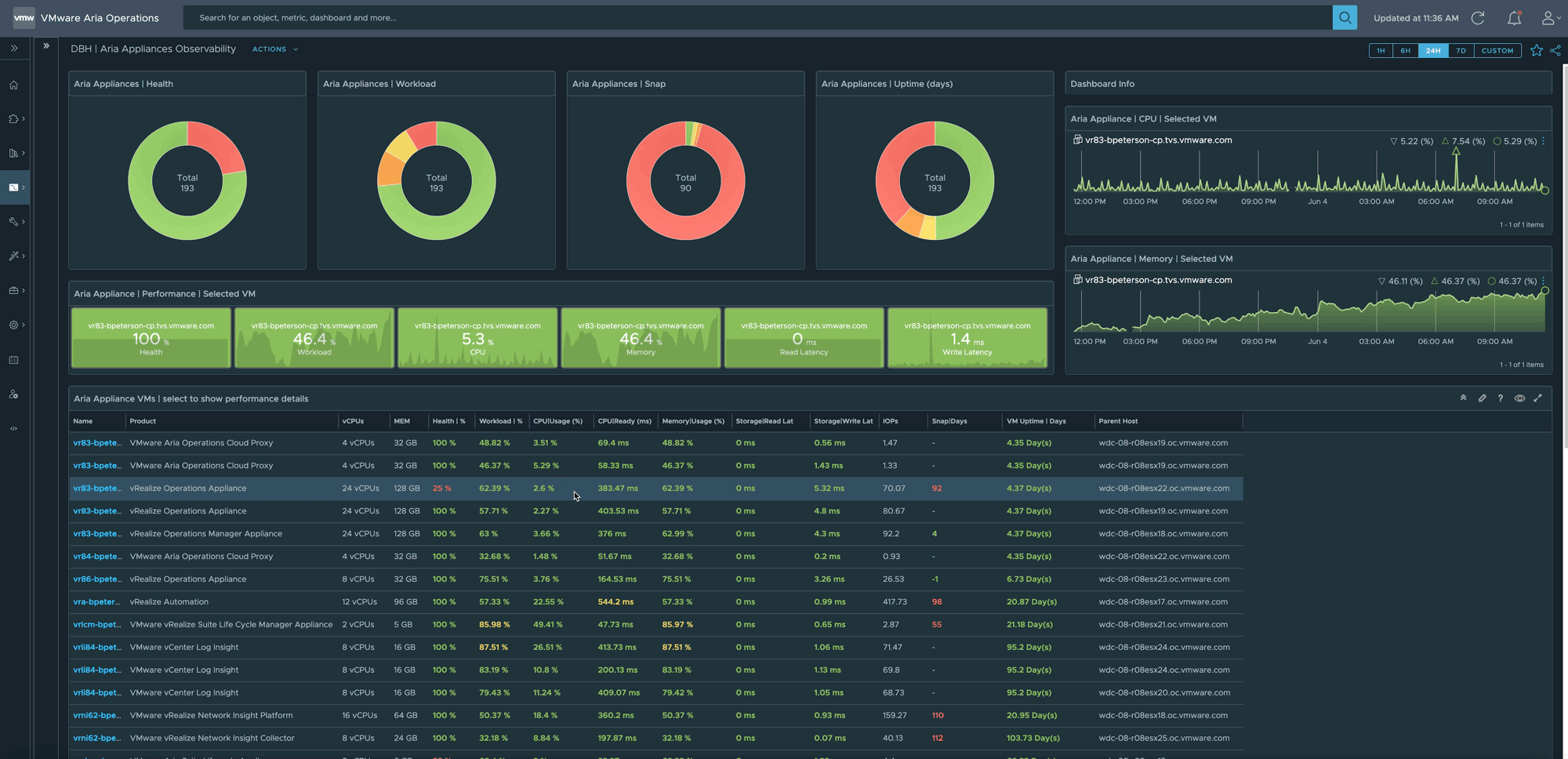 I have a strong preference against VMs running on snapshots for extended periods, which is why I included a chart for Snapshots. Uptime is also a crucial metric, as it provides insight into a VMs maintenance status. When I see a VM running for hundreds of days, my first thought is that it hasn’t been patched or upgraded in a while. To ensure the best reliability and access to the latest features, it’s important to keep Aria Appliances patched and upgraded regularly.