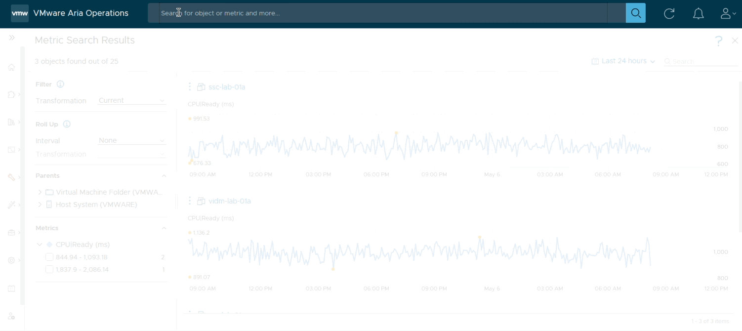 In this example the metric search found all VMs with CPU|Ready ms > 750 ms. When search is complete you can define the search further by selecting the parent host.