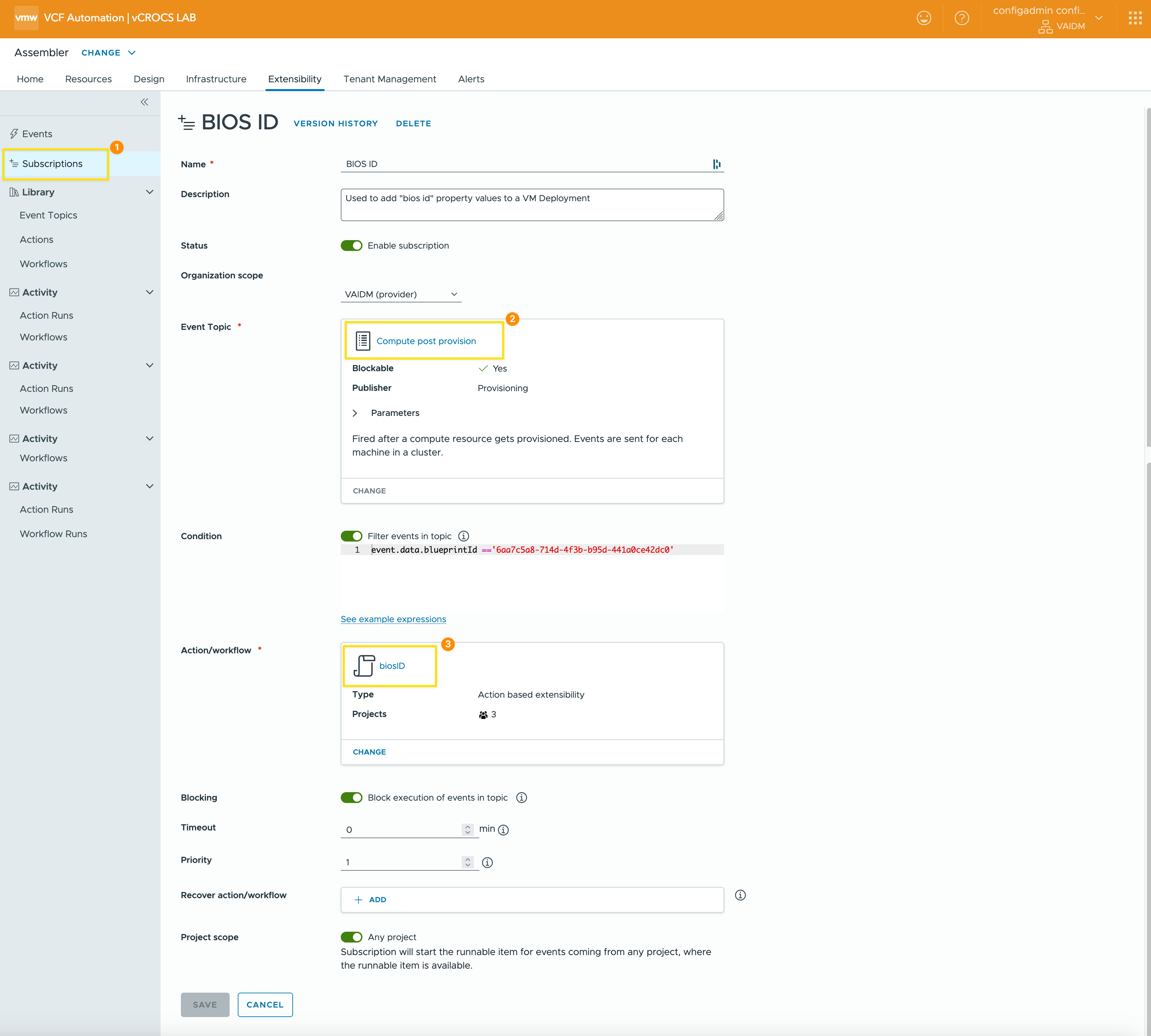- Set up a Subscription that triggers an ABX Action to run Post-Provisioning.