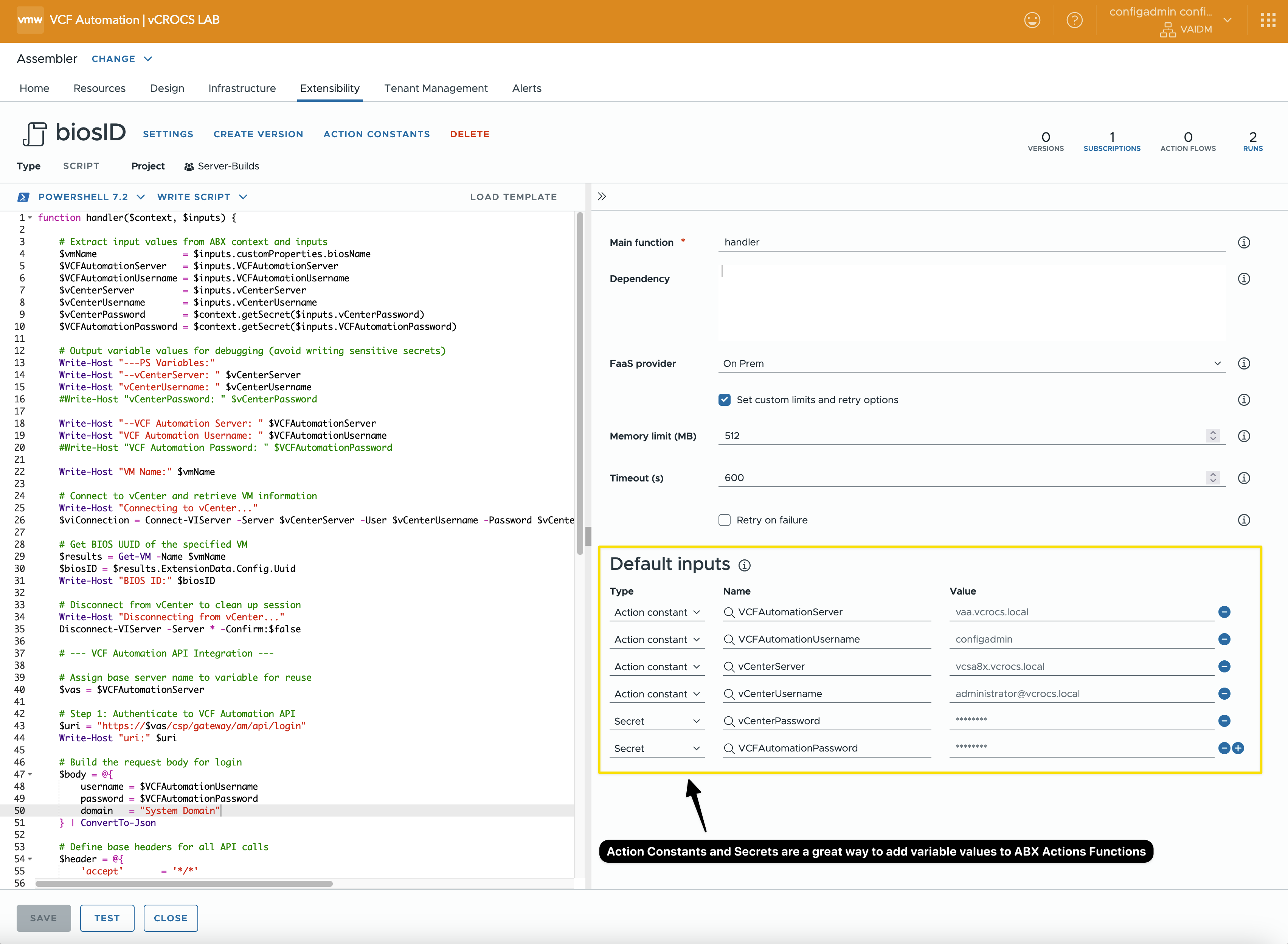 - The ABX Action connects to vCenter, retrieves the VM’s “bios id”, and writes it back as a customProperty on the deployment.