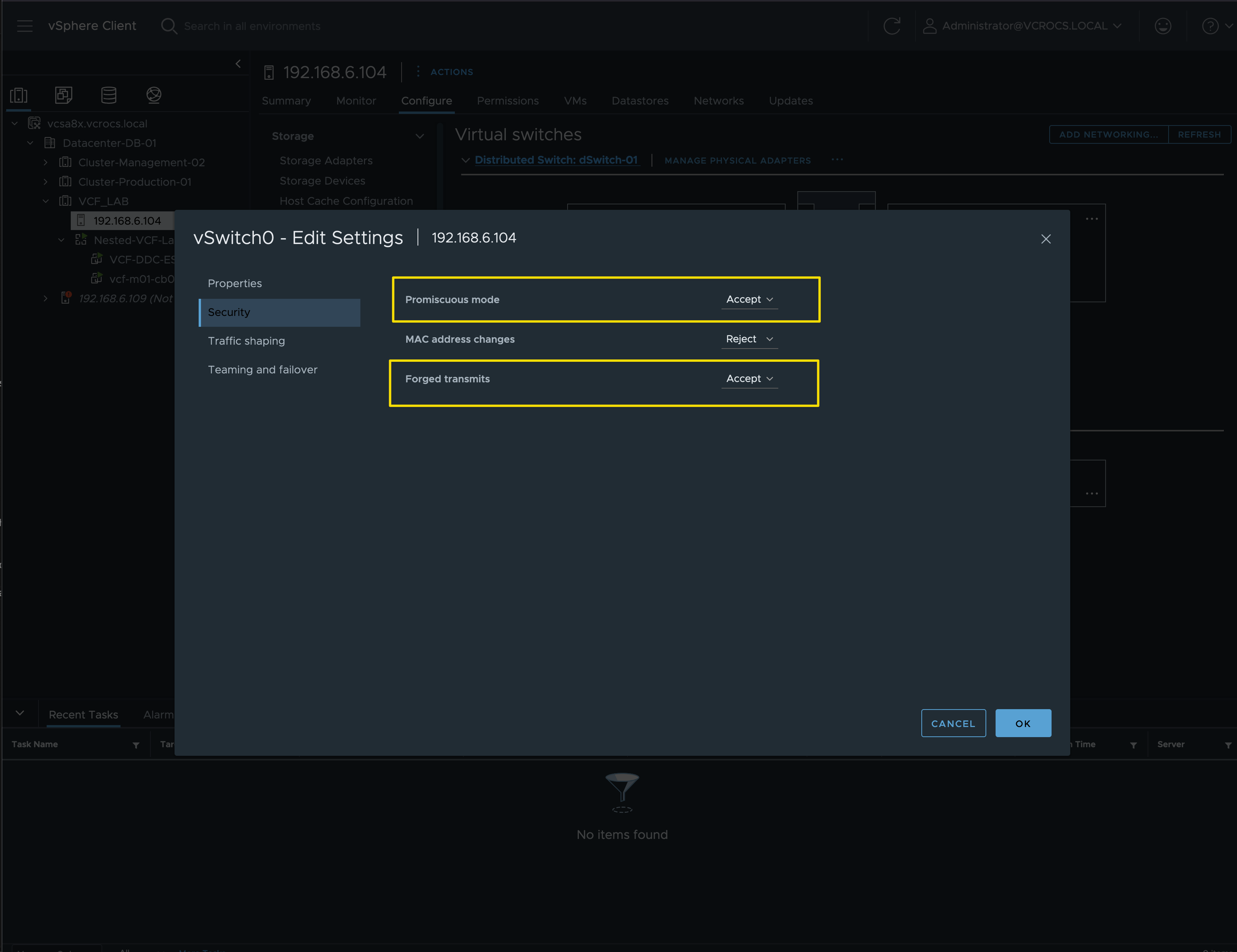 - Update the security settings on the vSwitch of the physical ESXi hosts running the nested ESXi hosts to ensure proper configuration (Refer to the screenshot above.)