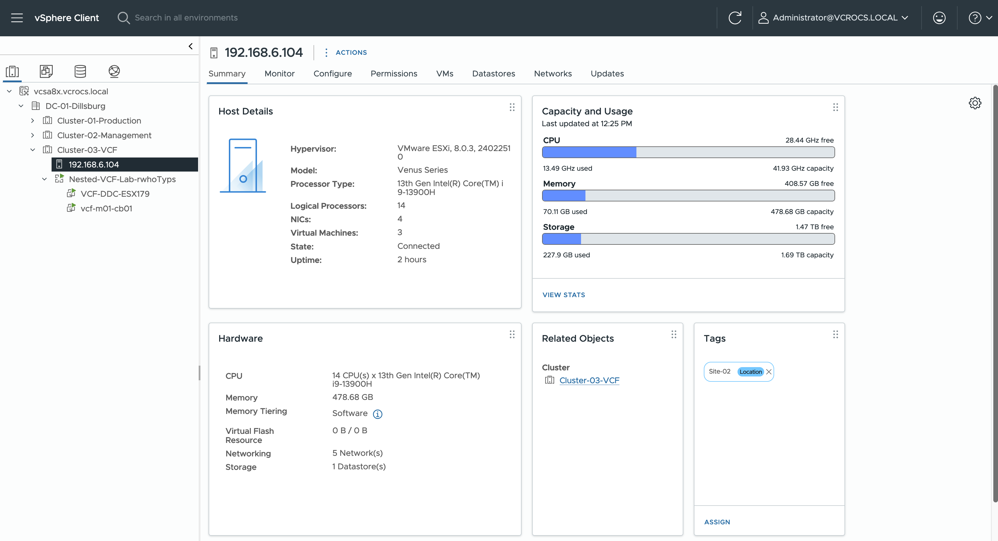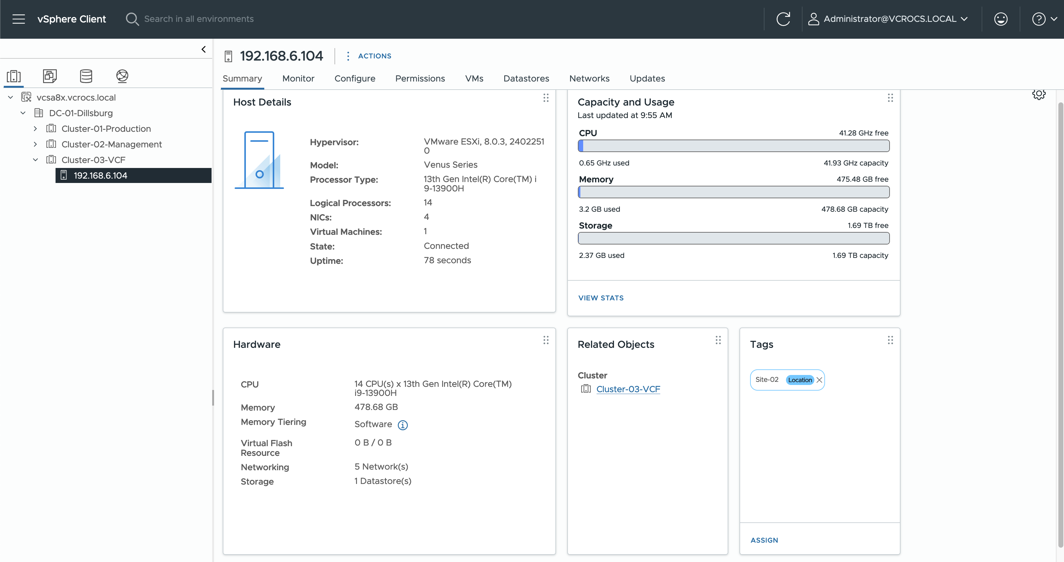 Screen Shot of the Physical Host (MS-01), Capacity and Usage, after the Nested ESXi and VCF Cloud Builder install: