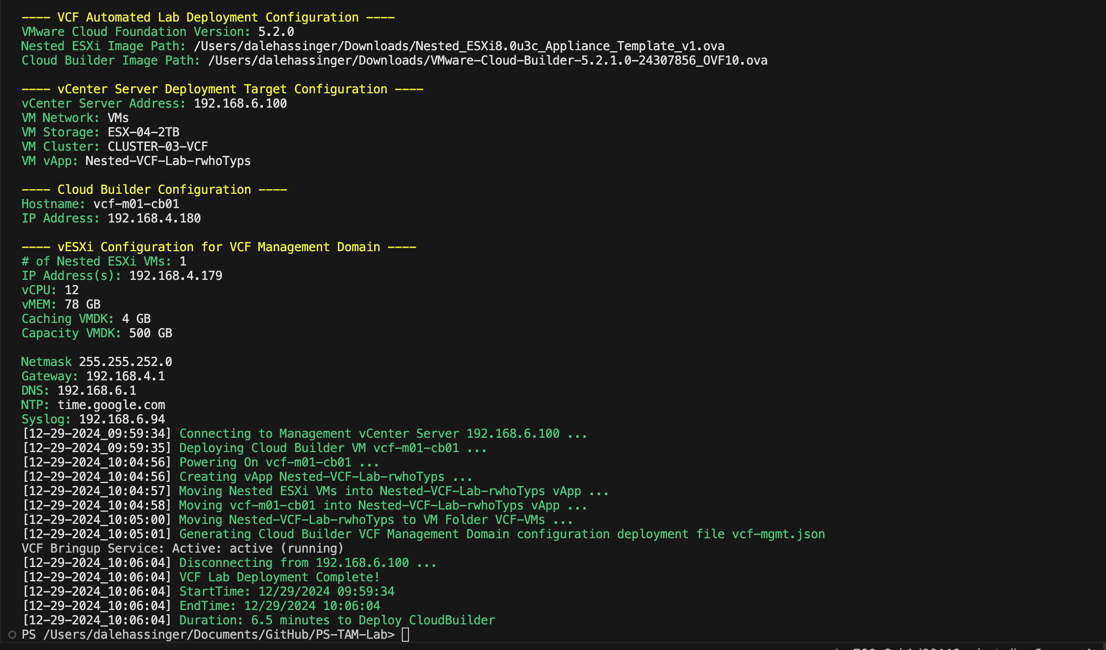 - This script takes approximately 1.25 to 1.5 hours to run and create a VCF SDDC Manager environment.