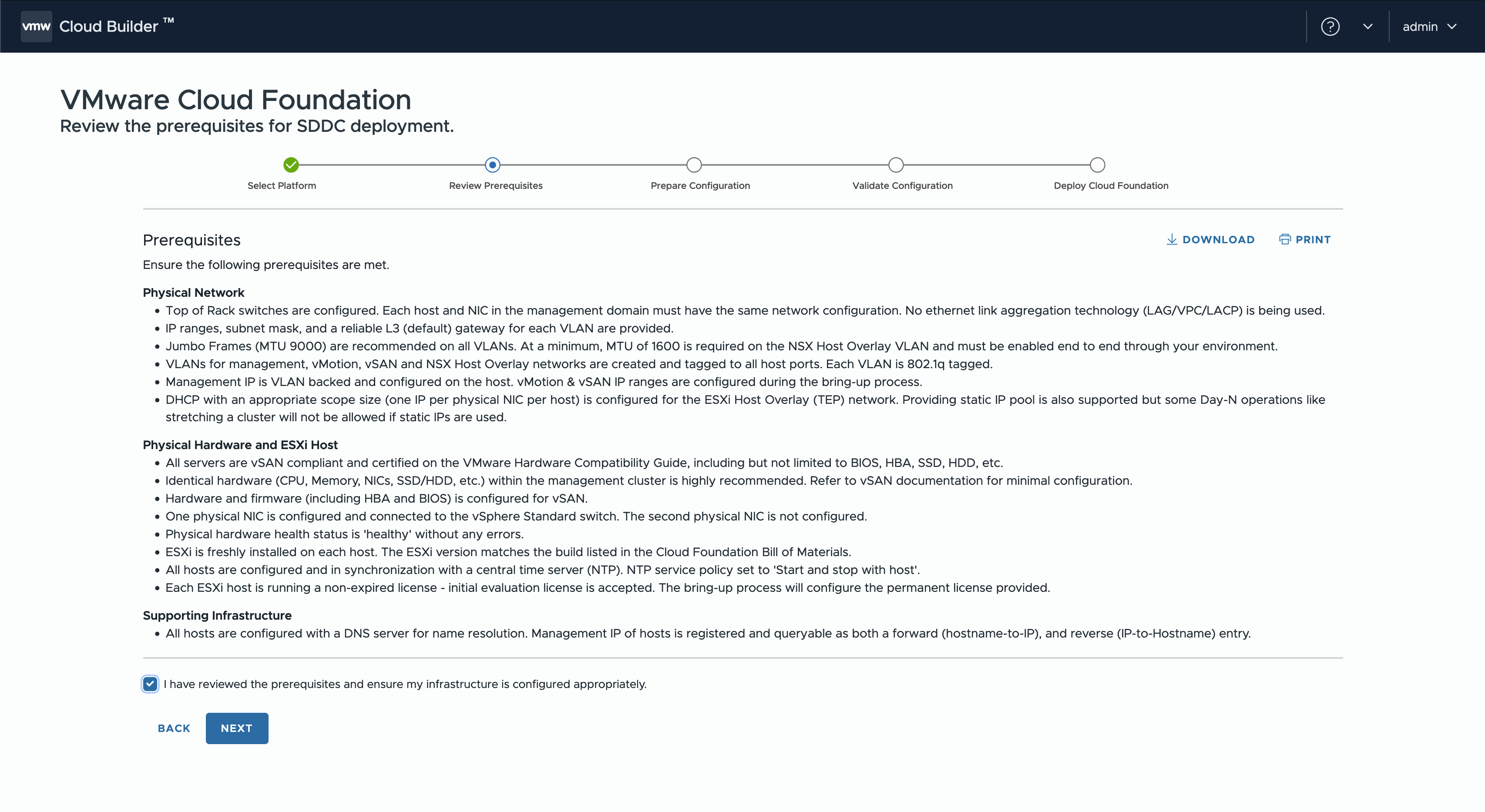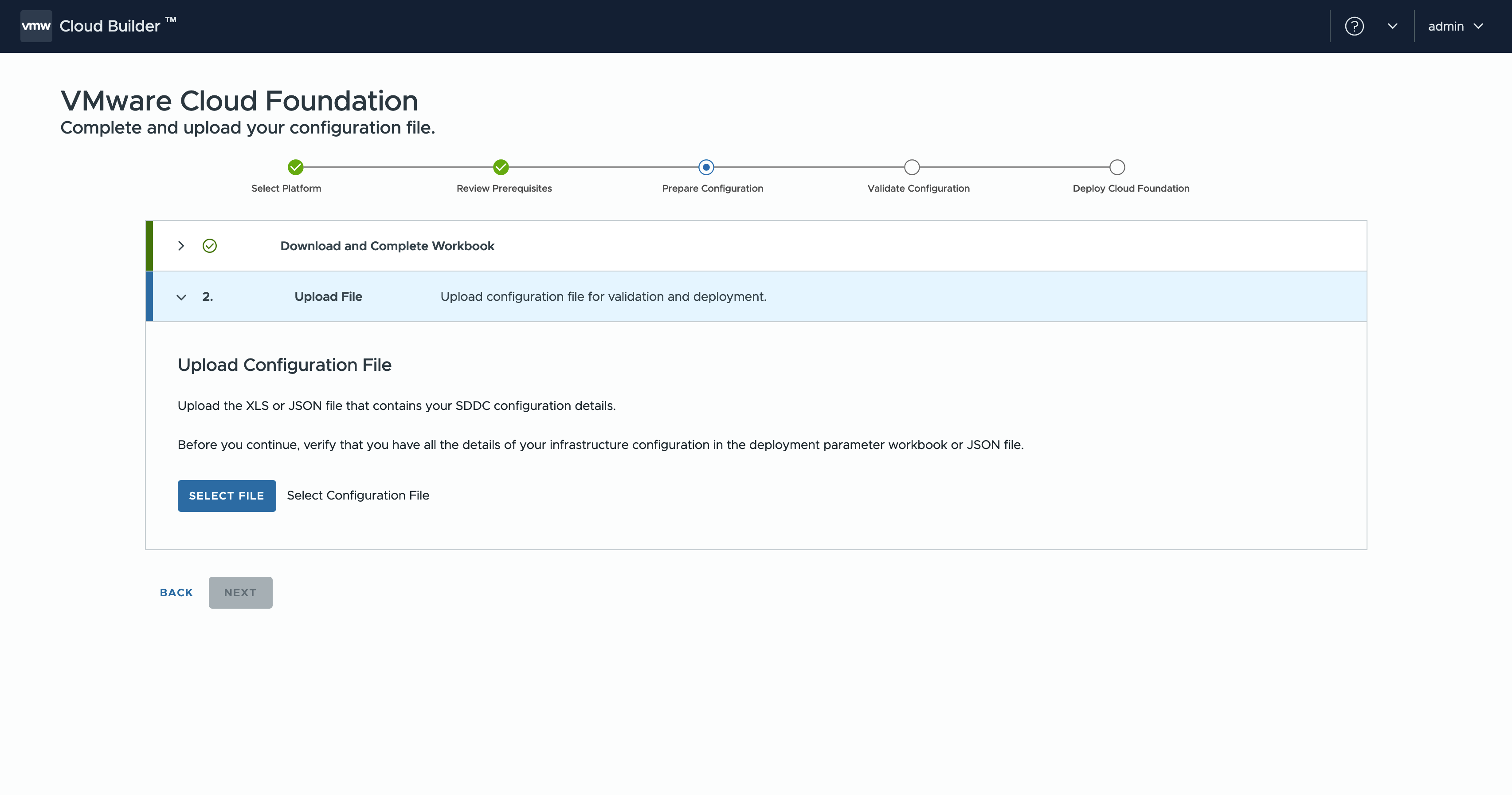 Screen Shot of VCF Cloud Builder Deploy wizard, step 1: