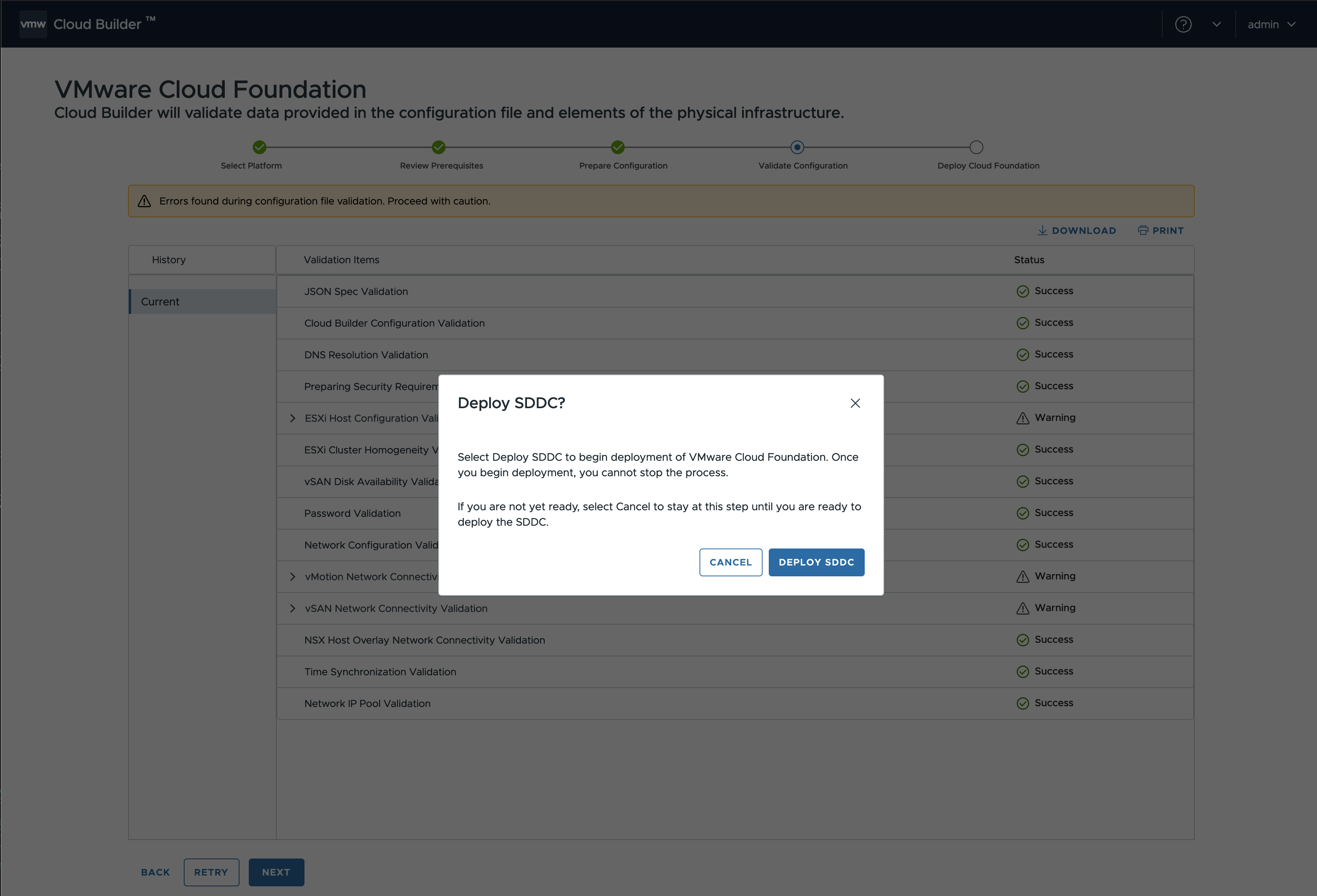 Screen Shot of VCF Cloud Builder Deploy wizard, step 2: