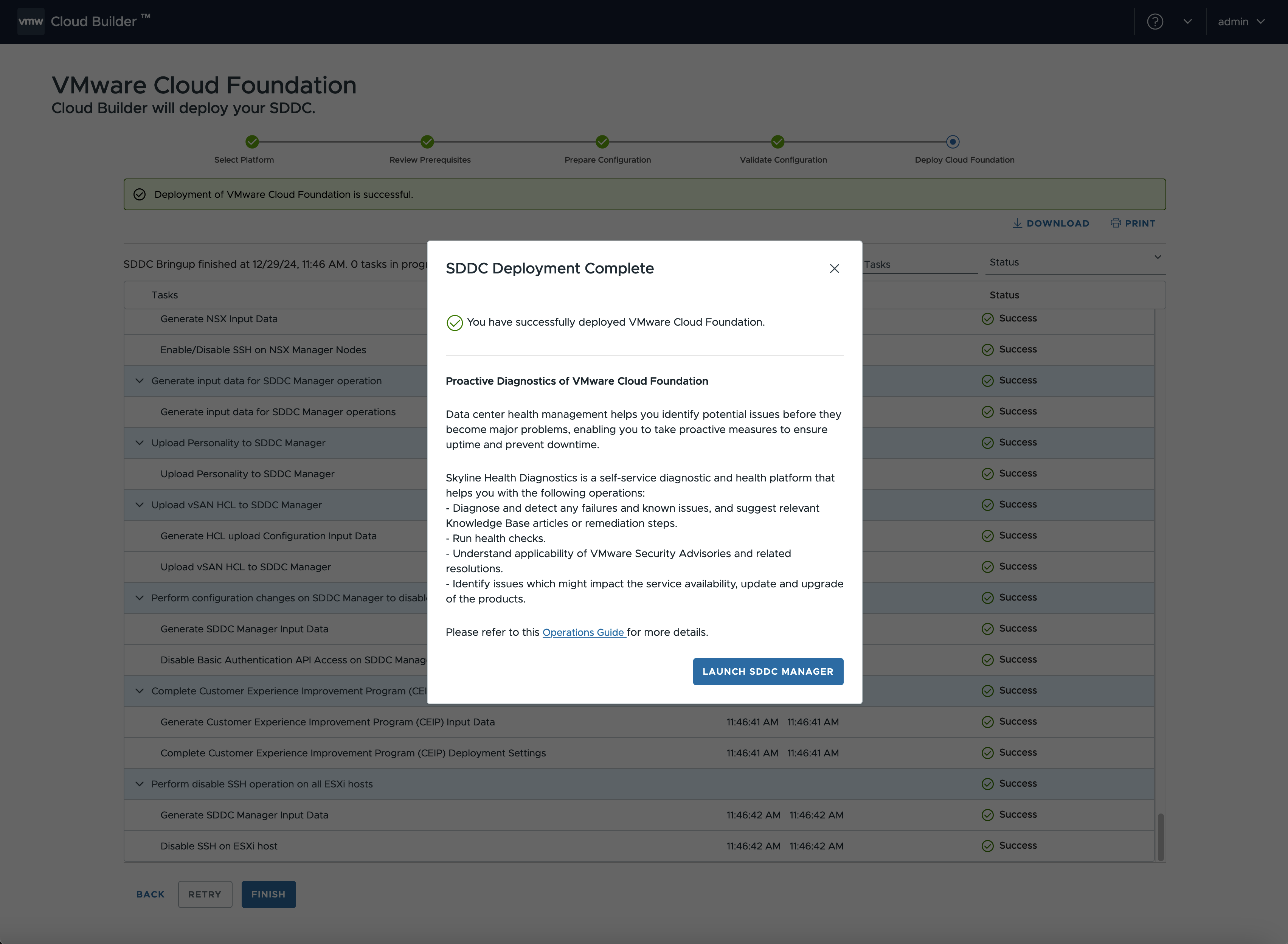 Screen Shot of the VCF Cloud Builder - Press button to launch SDDC Manager.