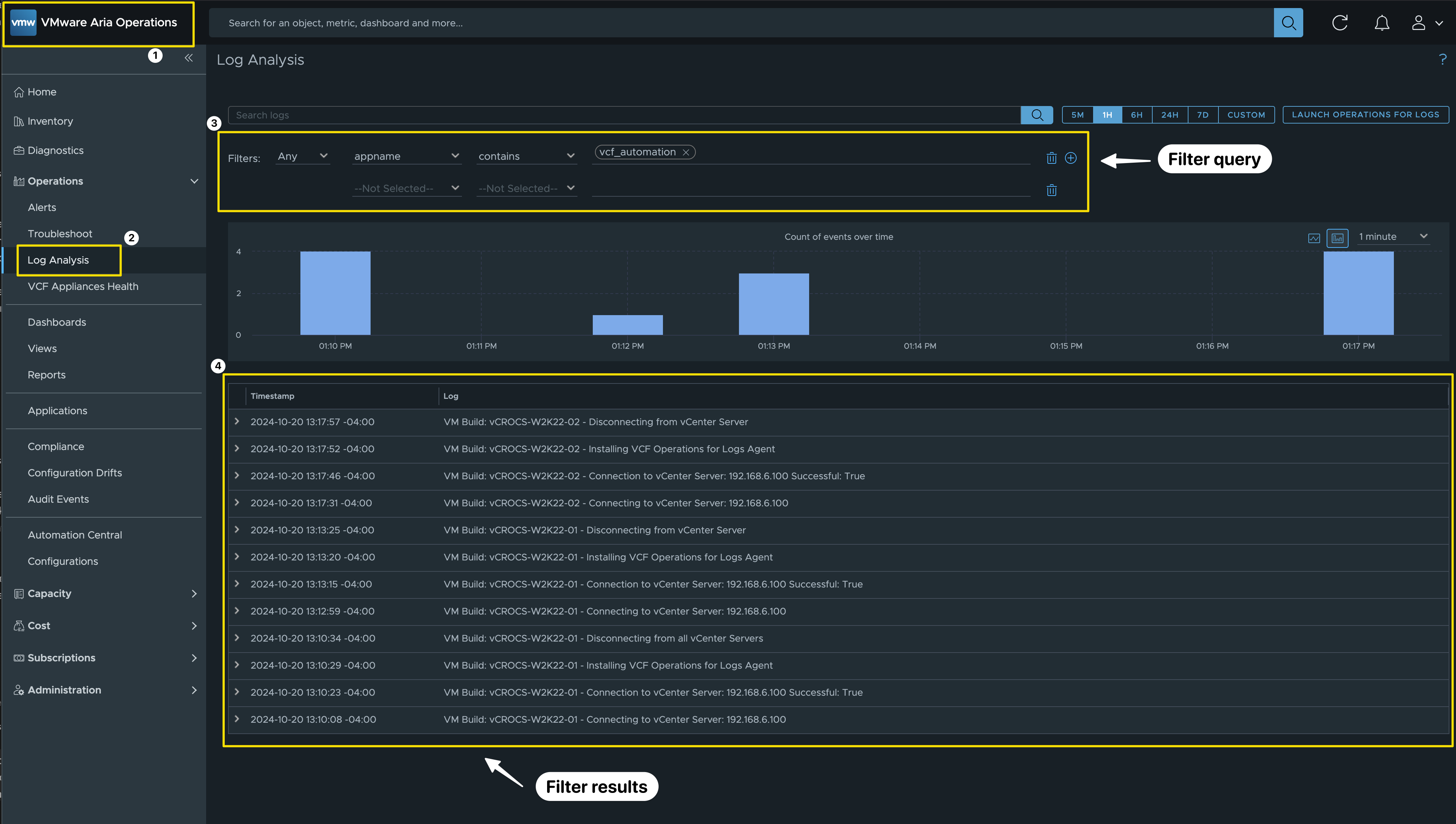 Screen Shot of the VCF Operations for Logs - Filter query and results: