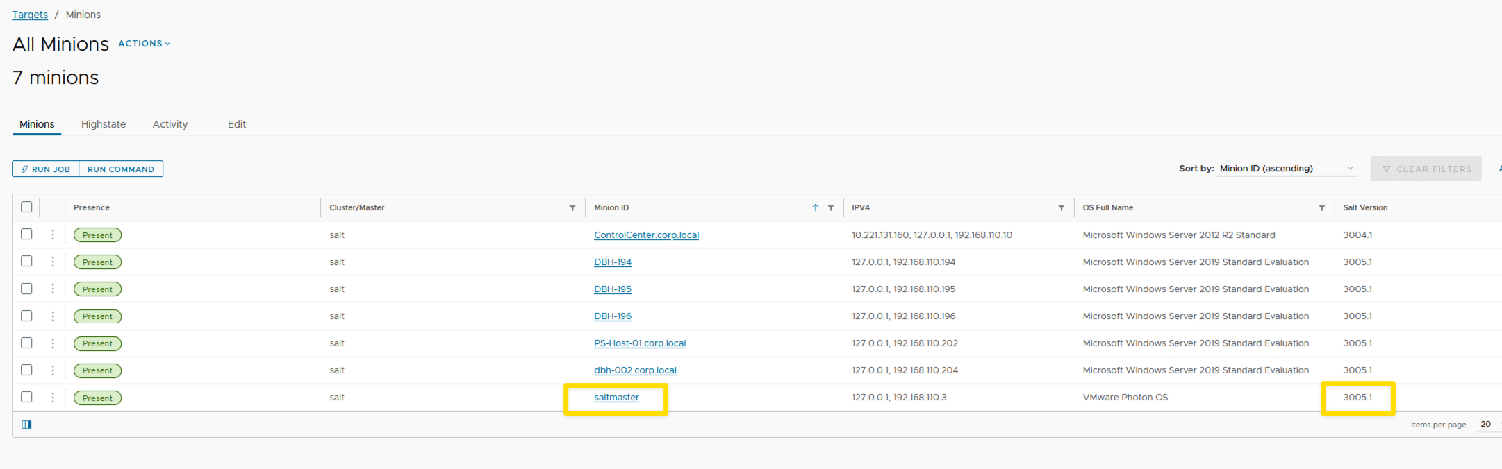 - When the minion agent installation is complete, you will see the new minion listed in the targets automatically. You do not need to accept the minion key.