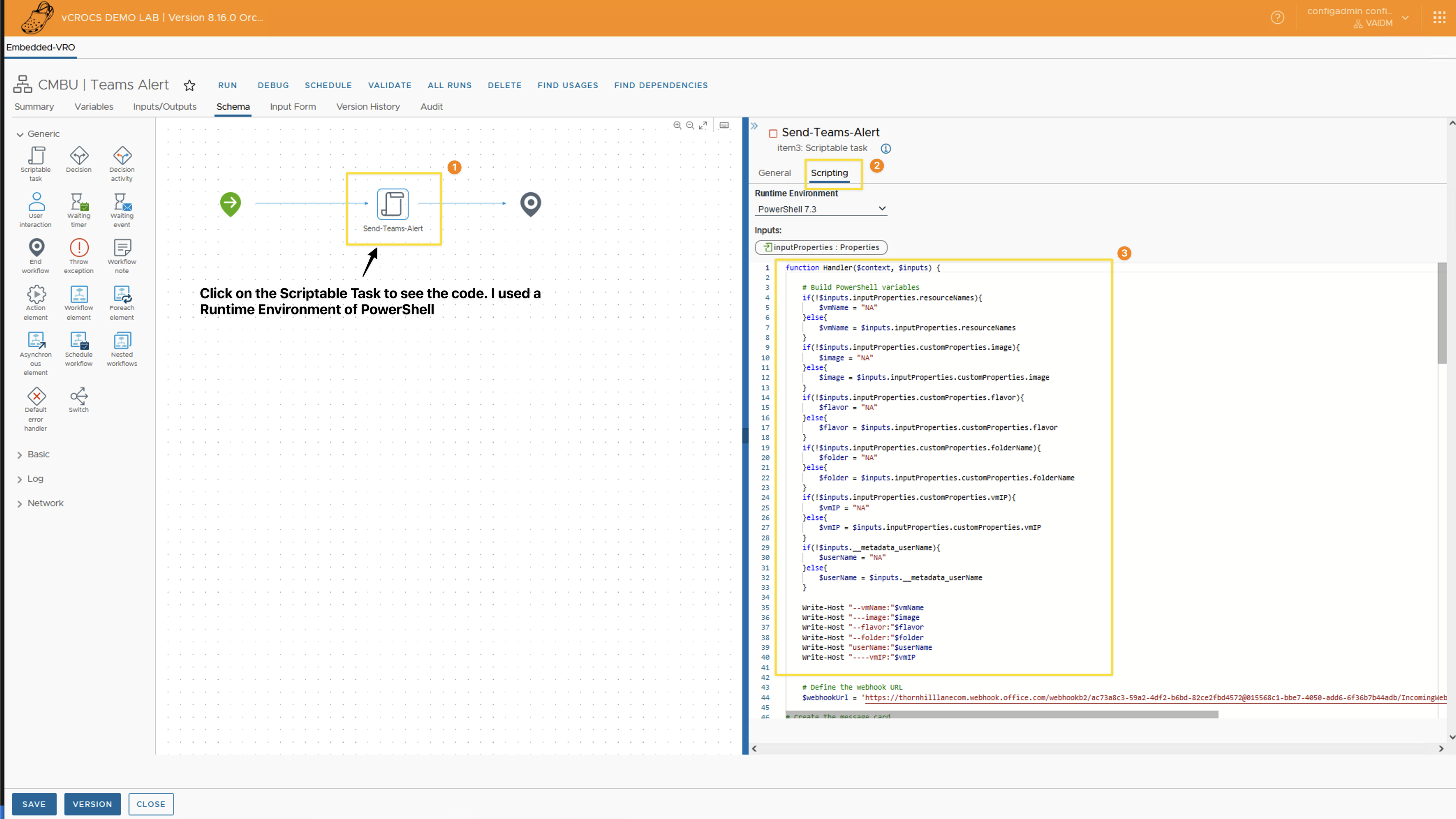 Whenever new VMs are deployed or Day 2 operations are executed via the VMware Aria Automation Catalog, I find it crucial to update our team through a common messaging platform about the ongoing creations or modifications. In this blog, I’ll demonstrate how to dispatch notifications to both Microsoft Teams and Google Spaces via a Webhook. This technique can be adapted for any messaging service such as Slack, Zoom, Discord, etc., by simply altering the JSON body formatting code and creating a Webhook for message delivery.