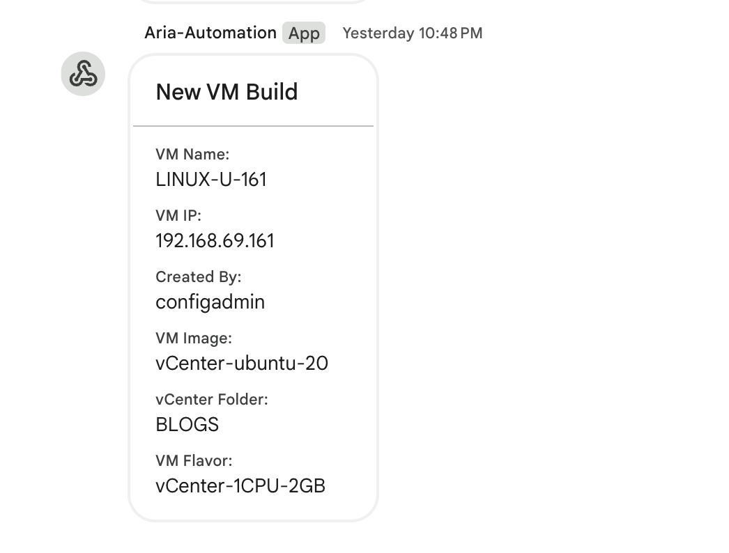 When all is configured and functioning properly, the Google Space message containing the New VM Build Details will appear as follows. Quite impressive!