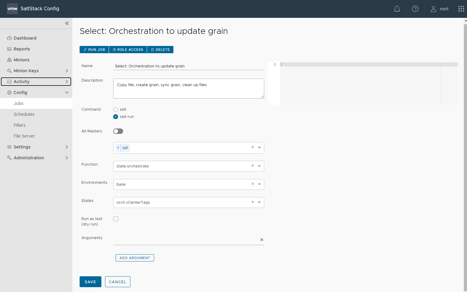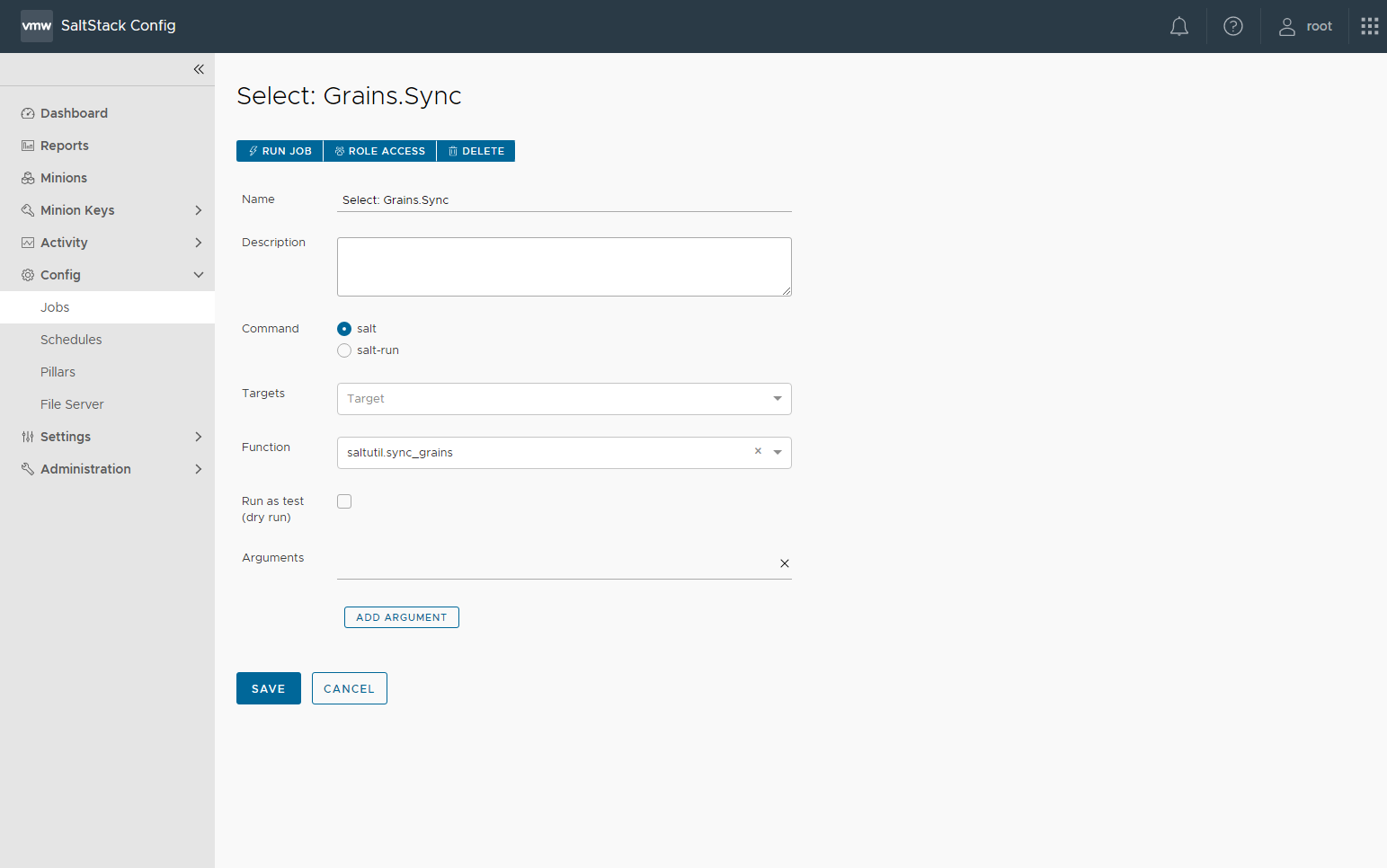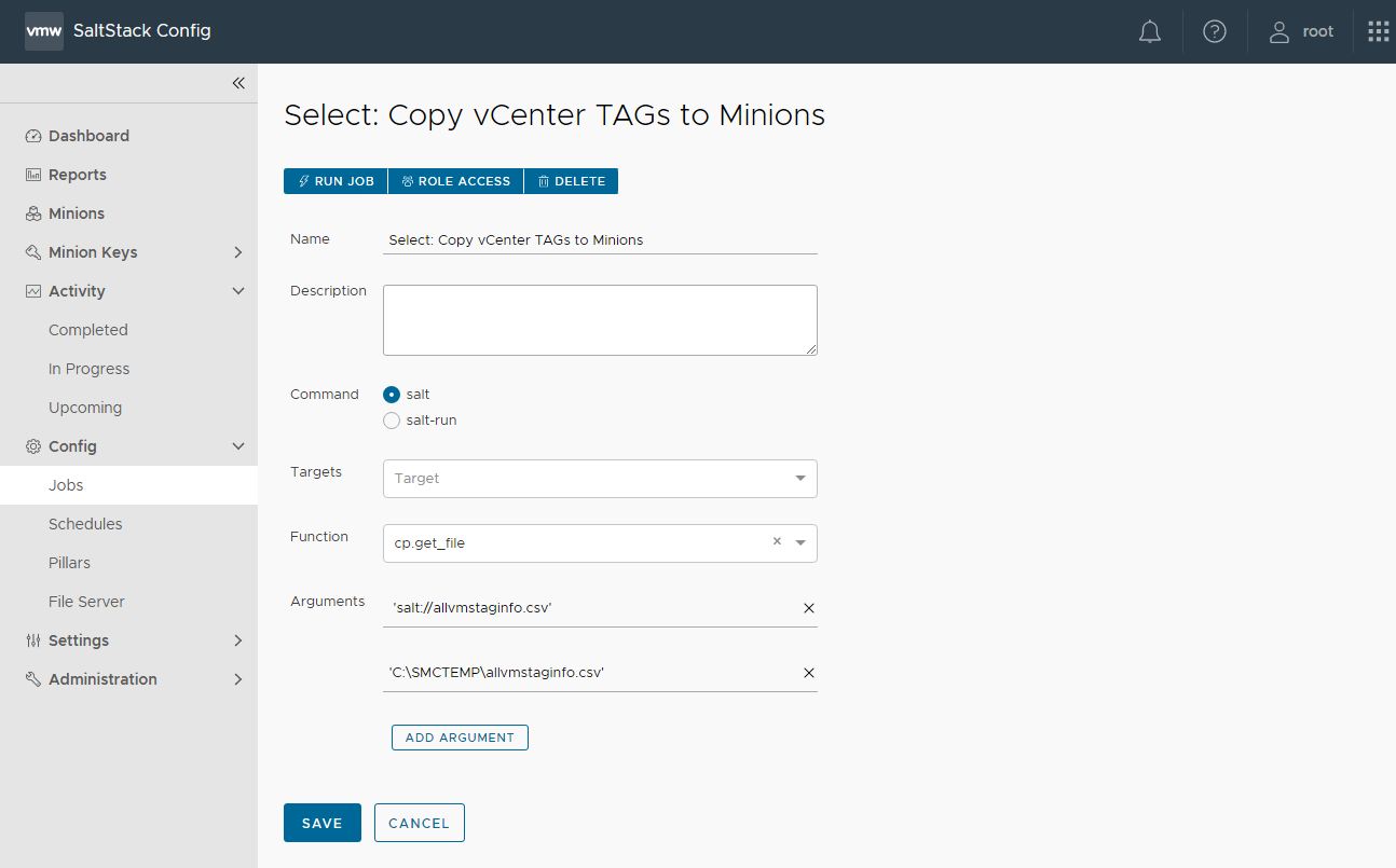 - In my example I wanted the grain to be named “vCenterTags” and the values will be the vCenter TAG names “TAG-VM-vCROCS|TAG-VM-WebServer|TAG-App-Hugo”. I have (3) vCenter TAGs assigned to this VM. I will be able to create a SaltStack Config Target based on any of the TAGs.