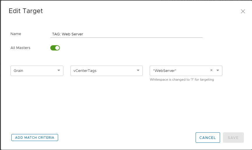 When I add the vCenter TAG information to the grains file I am then able to create SaltStack Config Targets based on the grain “vCenterTags”.
